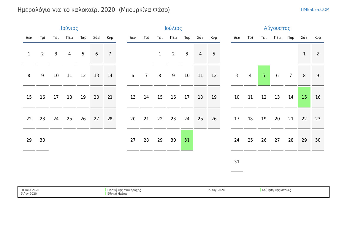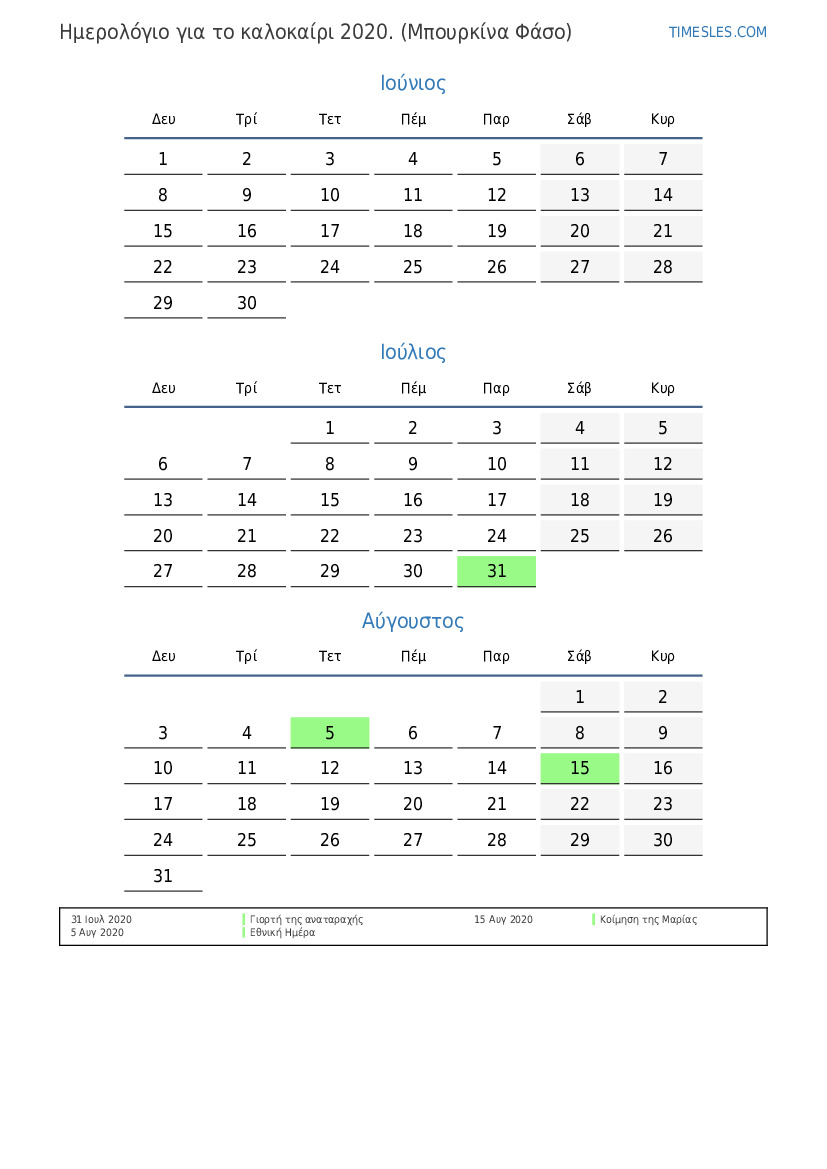 Λήψη και εκτύπωση ημερολογίου PDF με αργίες και σαββατοκύριακα για το καλοκαίρι του 2020 για την Μπουρκίνα Φάσο
