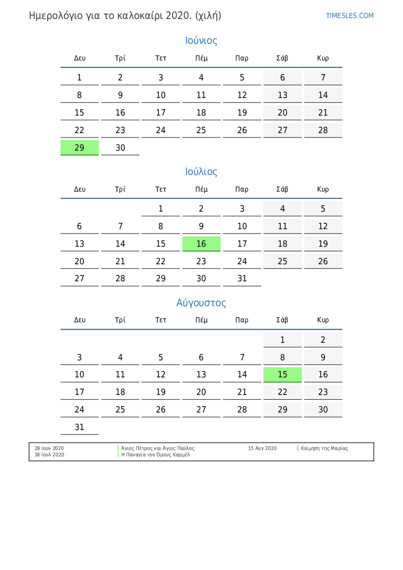 Λήψη και εκτύπωση ημερολογίου PDF με αργίες και σαββατοκύριακα για το καλοκαίρι του 2020 για τη Χιλή
