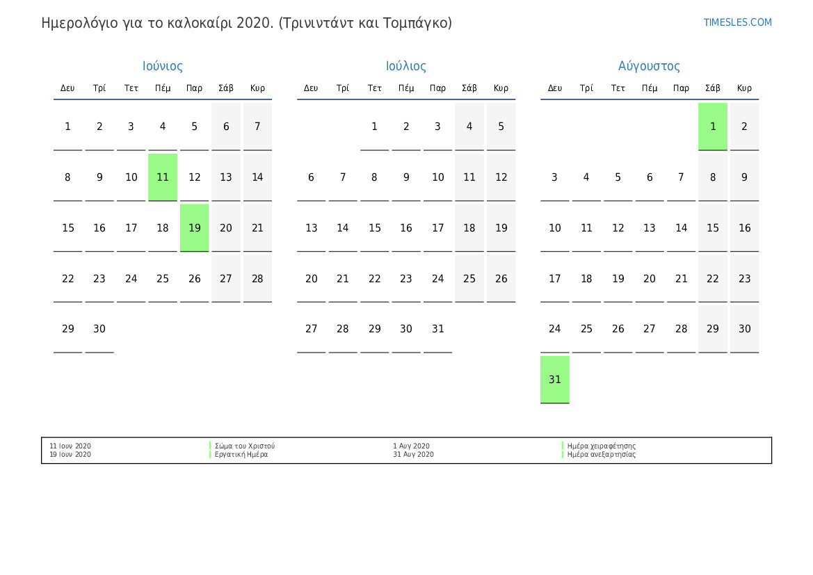 Ημερολόγιο για το καλοκαίρι 2020 για το Τρινιντάντ και Τομπάγκο