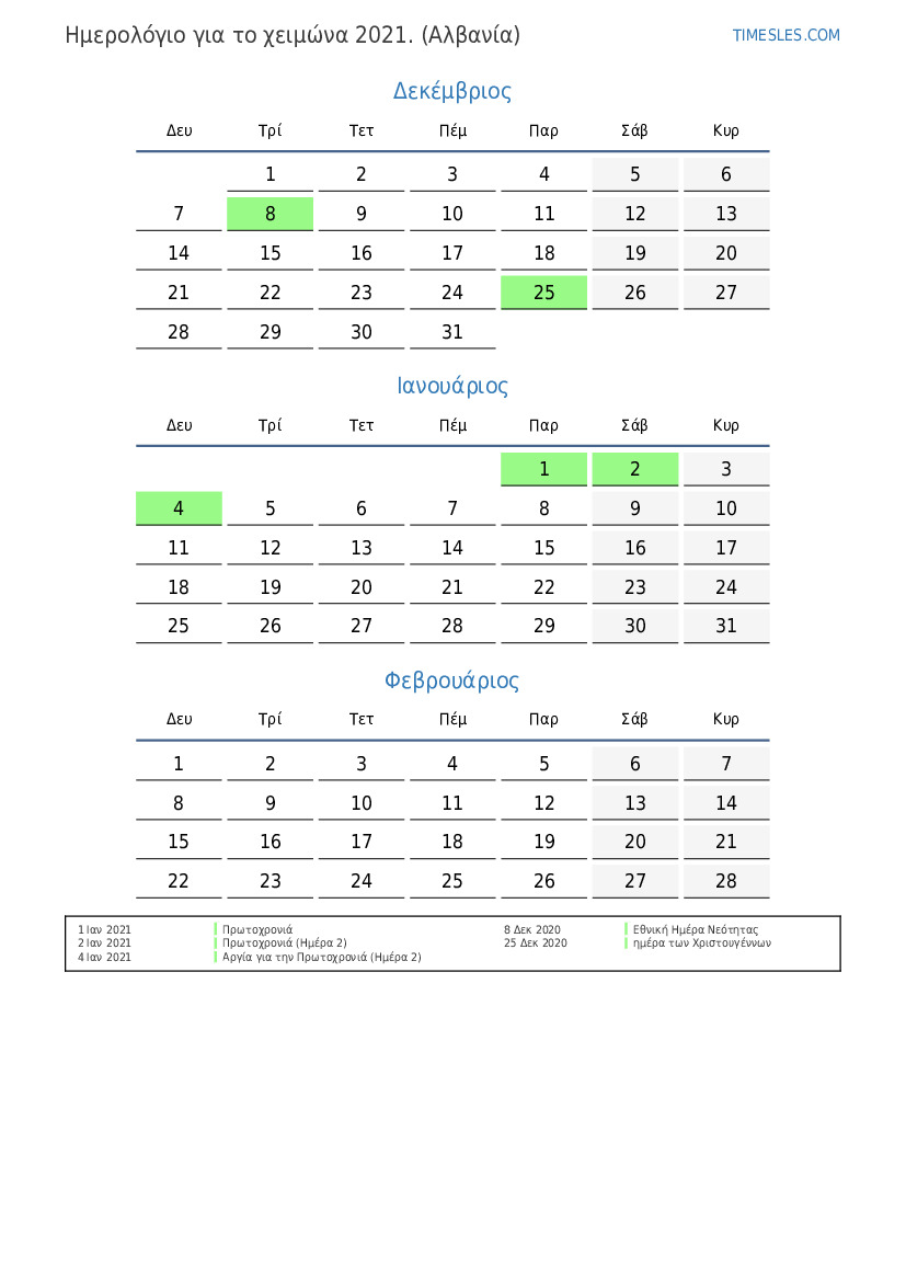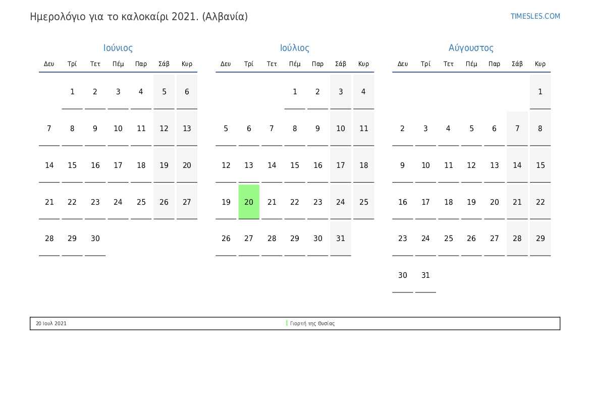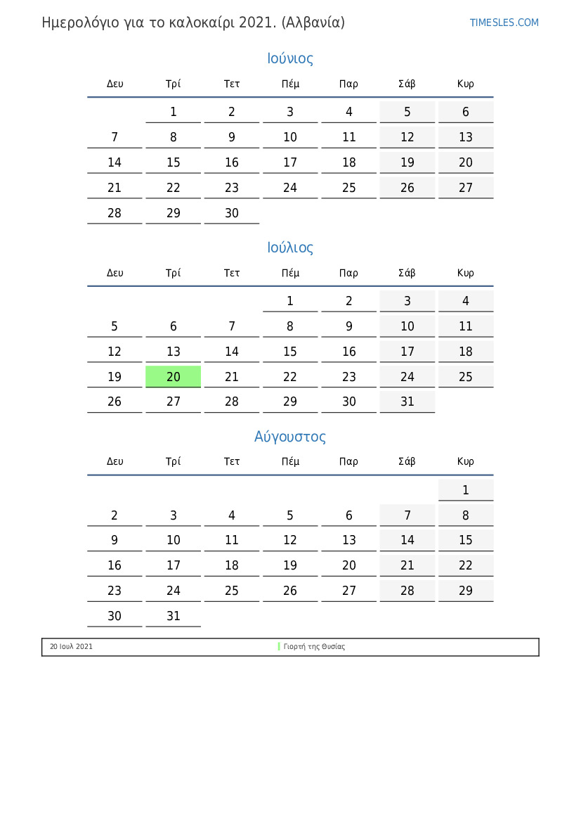 Λήψη και εκτύπωση ημερολογίου PDF με αργίες και σαββατοκύριακα για το καλοκαίρι του 2021 για την Αλβανία