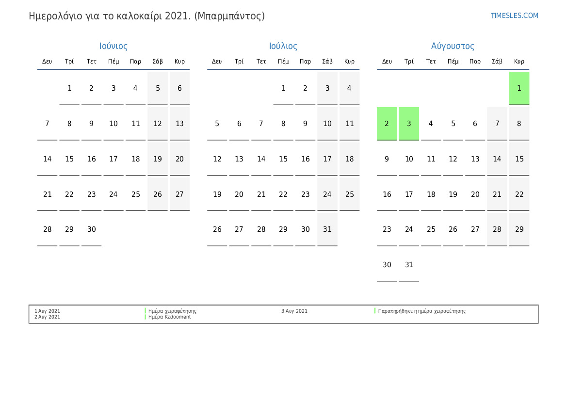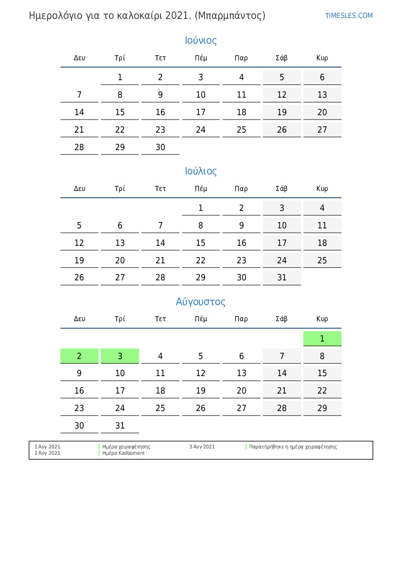 Ημερολόγιο για το καλοκαίρι 2021 για τα Μπαρμπάντος