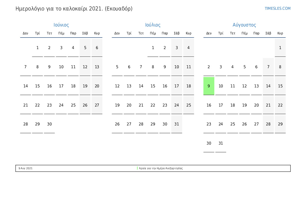 Λήψη και εκτύπωση ημερολογίου PDF με αργίες και σαββατοκύριακα για το καλοκαίρι του 2021 για τον Ισημερινό
