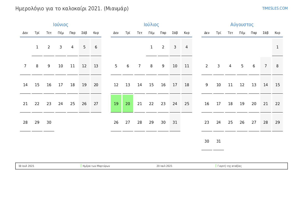 Λήψη και εκτύπωση ημερολογίου PDF με αργίες και σαββατοκύριακα για το καλοκαίρι του 2021 για τη Μιανμάρ