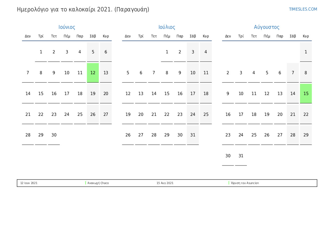 Ημερολόγιο αργιών και σαββατοκύριακων για το καλοκαίρι του 2021 για την Παραγουάη