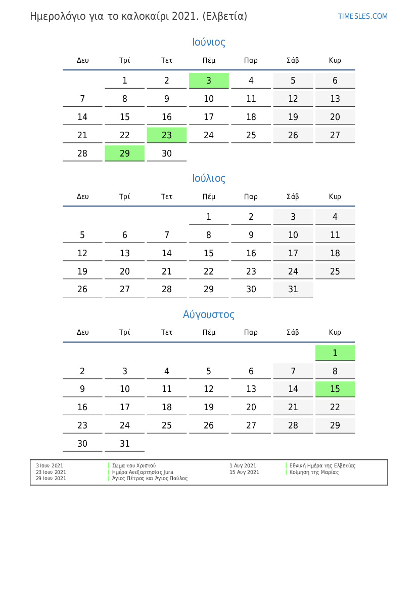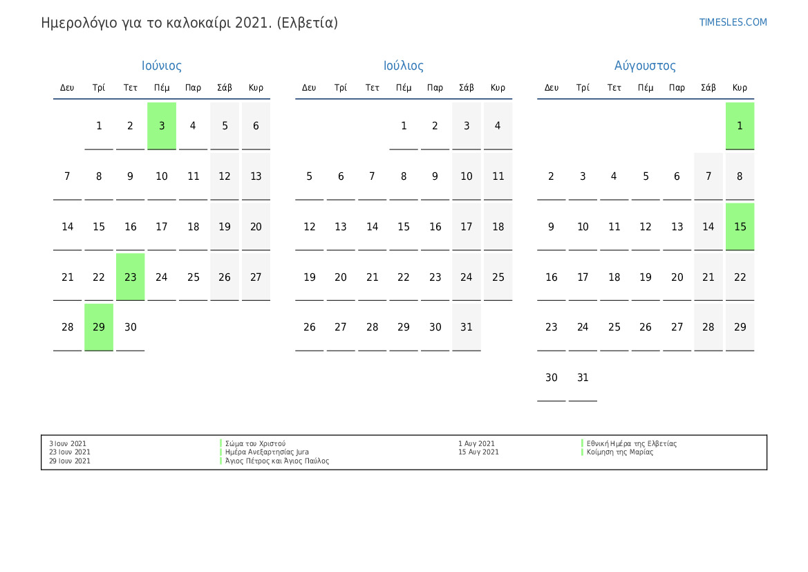 Λήψη και εκτύπωση ημερολογίου PDF με αργίες και σαββατοκύριακα για το καλοκαίρι του 2021 για την Ελβετία