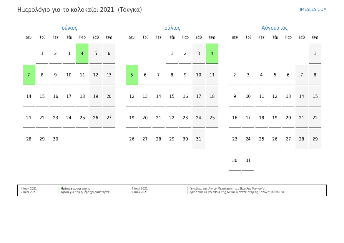 Λήψη και εκτύπωση ημερολογίου PDF με αργίες και σαββατοκύριακα για το καλοκαίρι του 2021 για την Τόνγκα