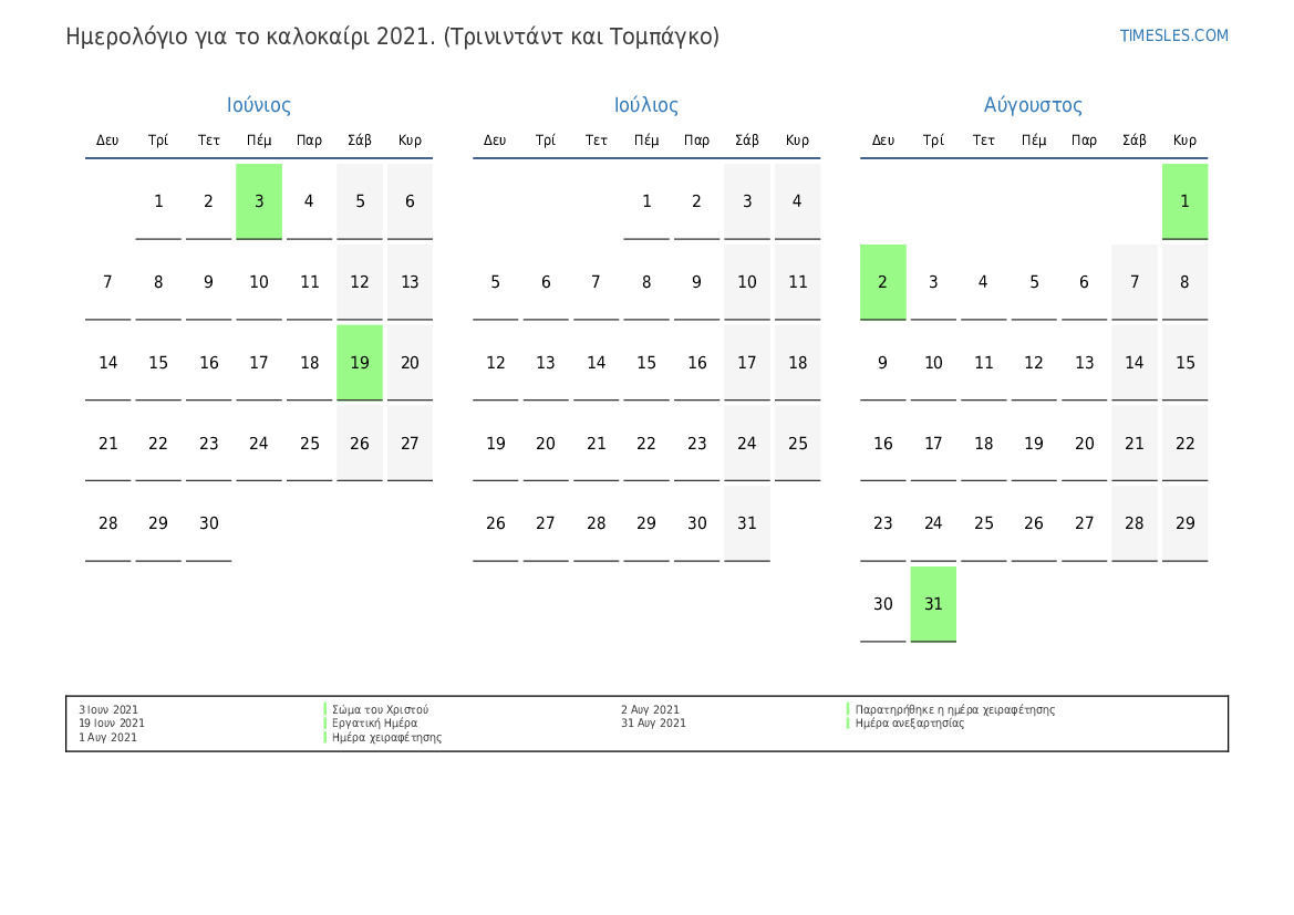 Ημερολόγιο για το καλοκαίρι 2021 για το Τρινιντάντ και Τομπάγκο