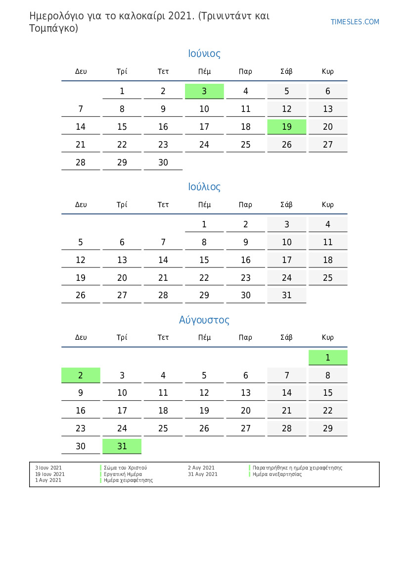 Ημερολόγιο αργιών και σαββατοκύριακων για το καλοκαίρι του 2021 για το Τρινιντάντ και Τομπάγκο