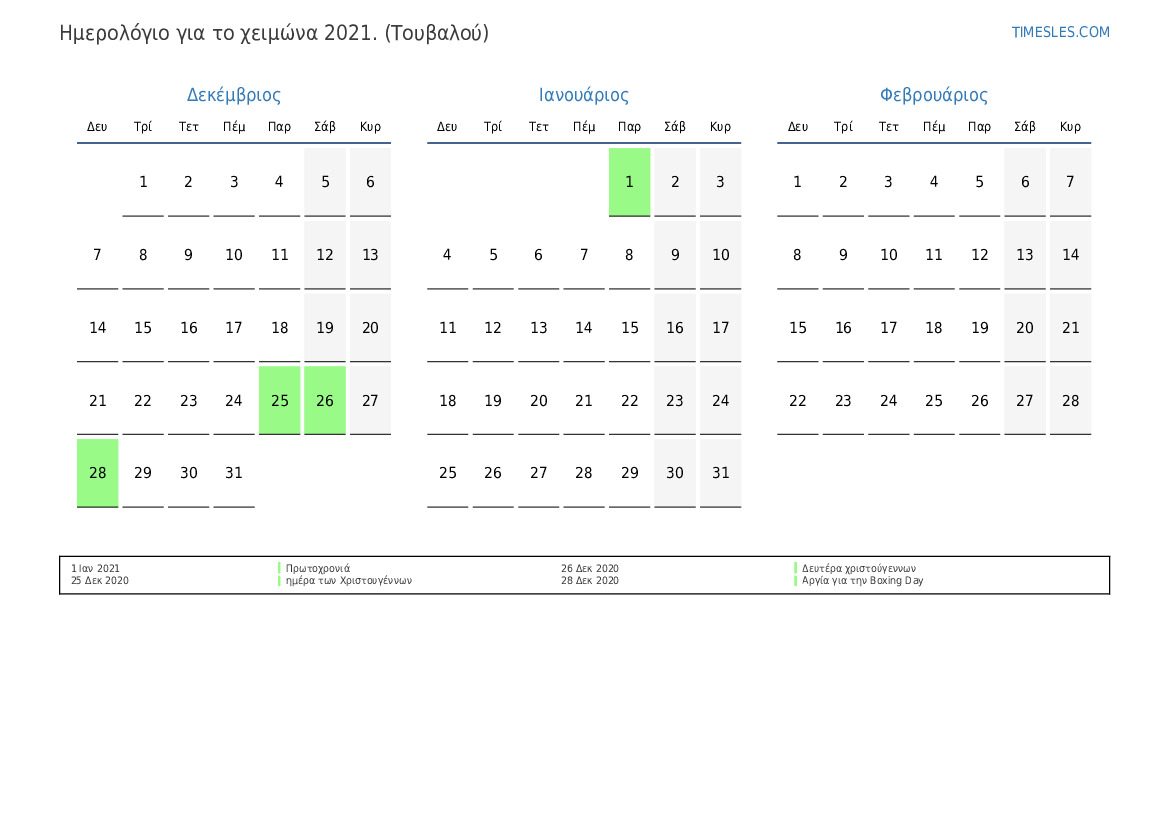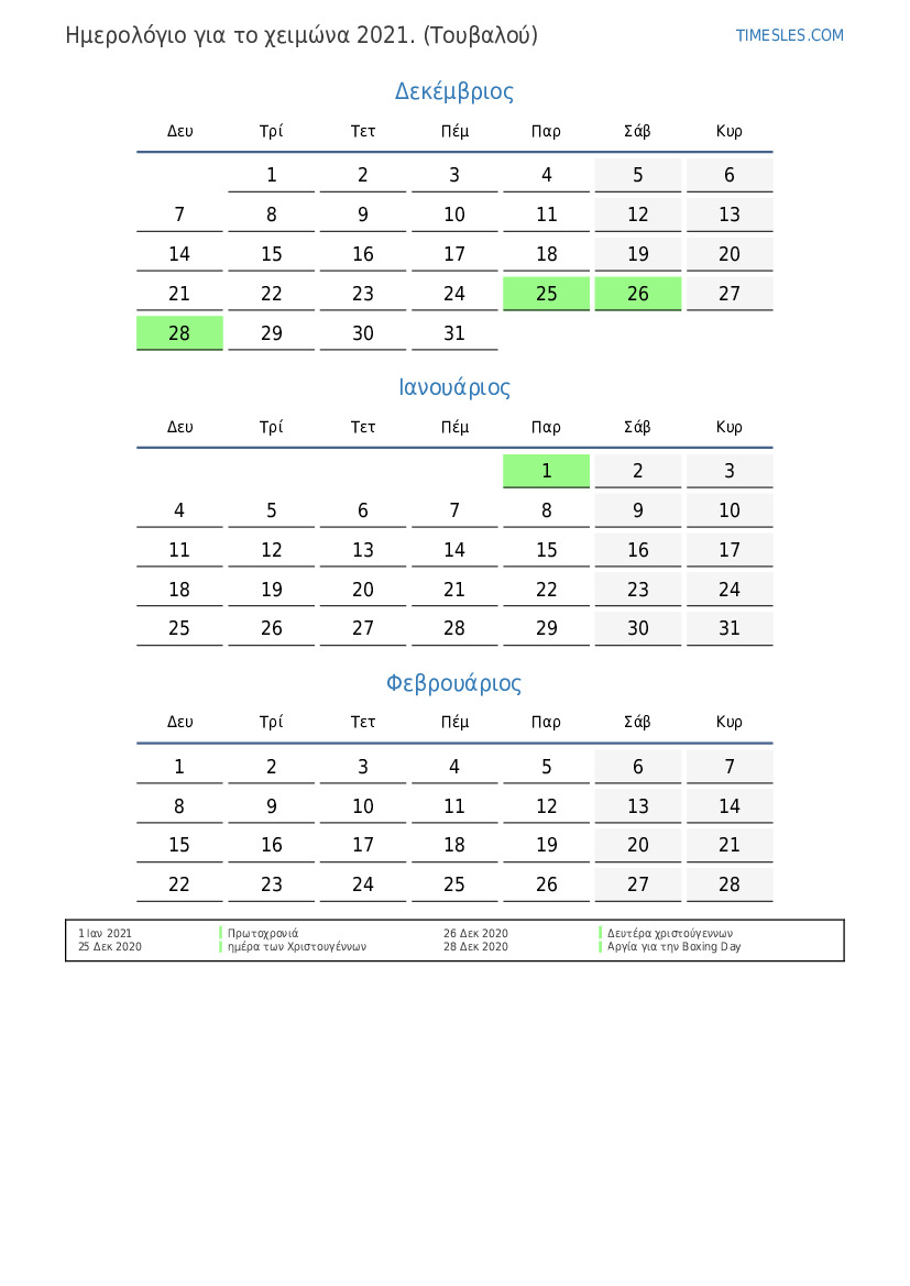 Ημερολόγιο αργιών και σαββατοκύριακων για το καλοκαίρι του 2021 για το Τουβαλού