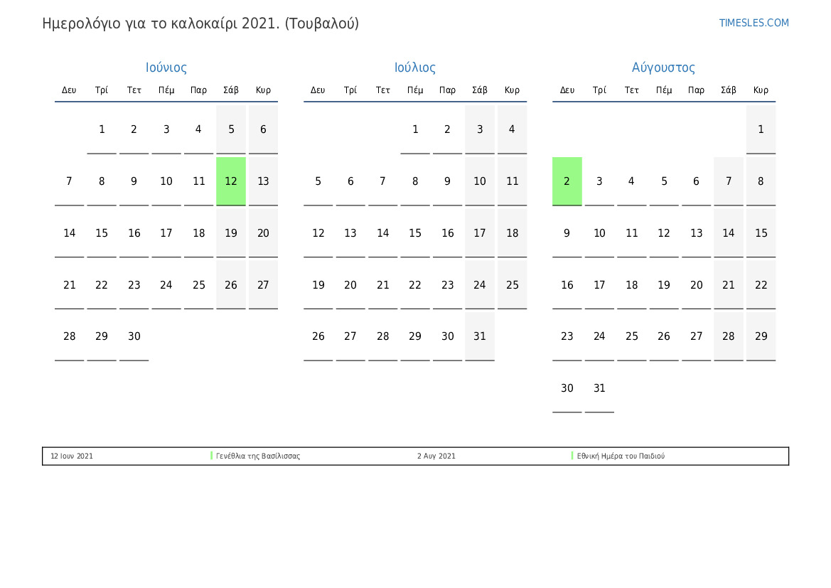 Λήψη και εκτύπωση ημερολογίου PDF με αργίες και σαββατοκύριακα για το καλοκαίρι του 2021 για το Τουβαλού
