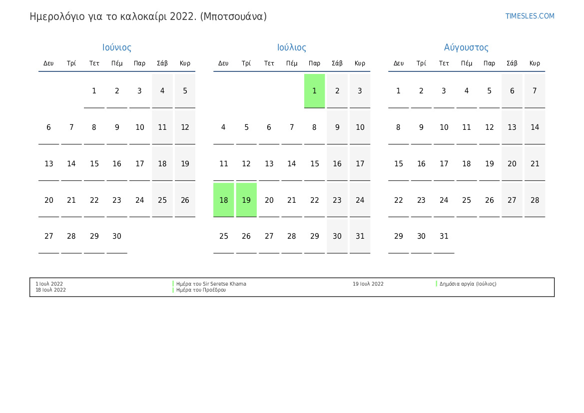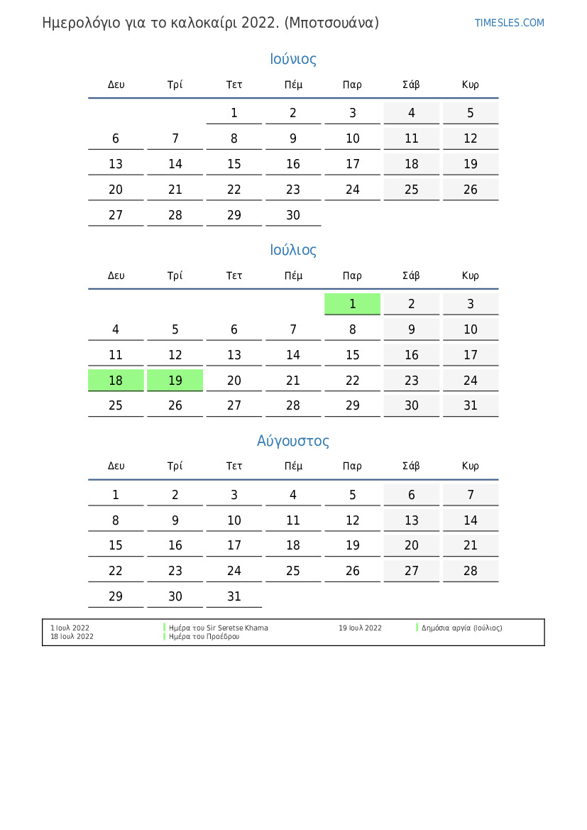 Ημερολόγιο αργιών και σαββατοκύριακων για το καλοκαίρι του 2022 για την Μποτσουάνα