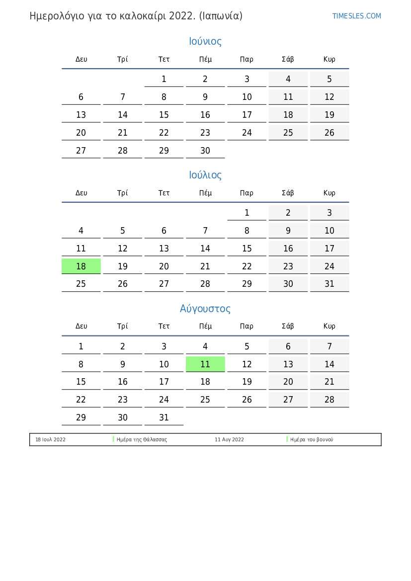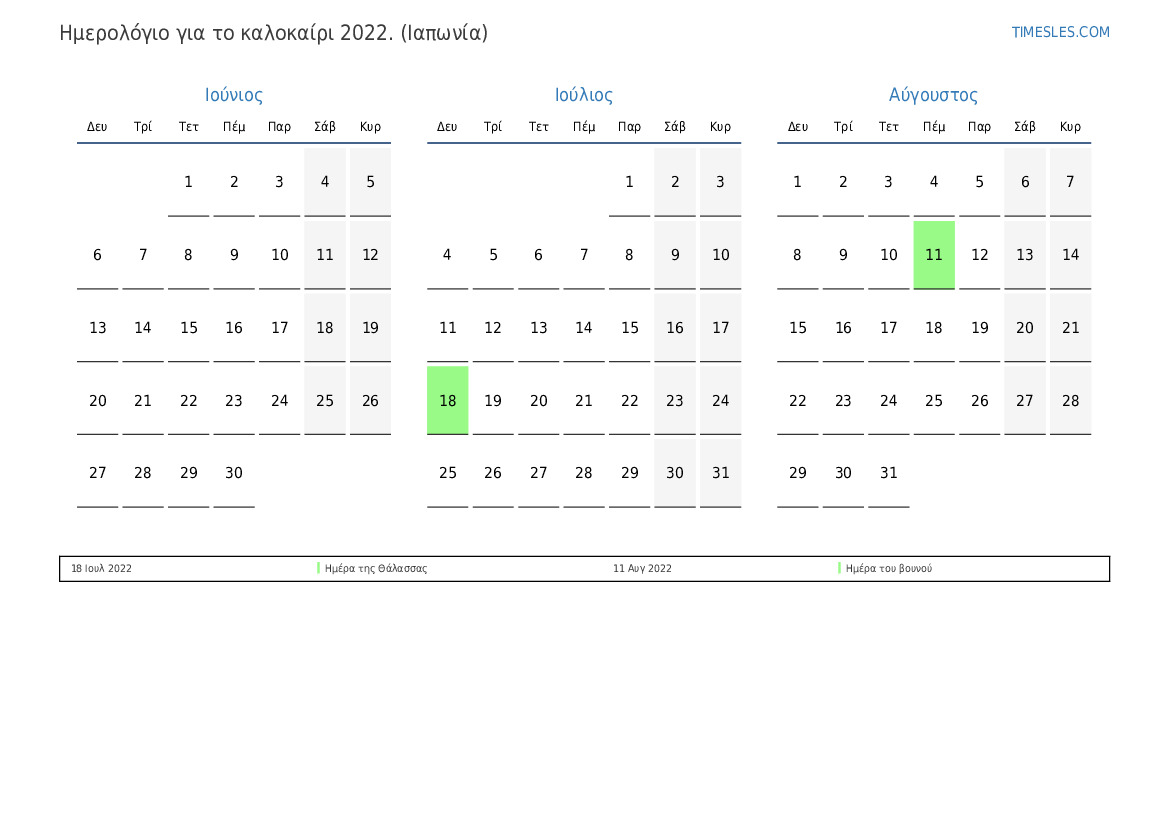 Ημερολόγιο για το καλοκαίρι 2022 για την Ιαπωνία