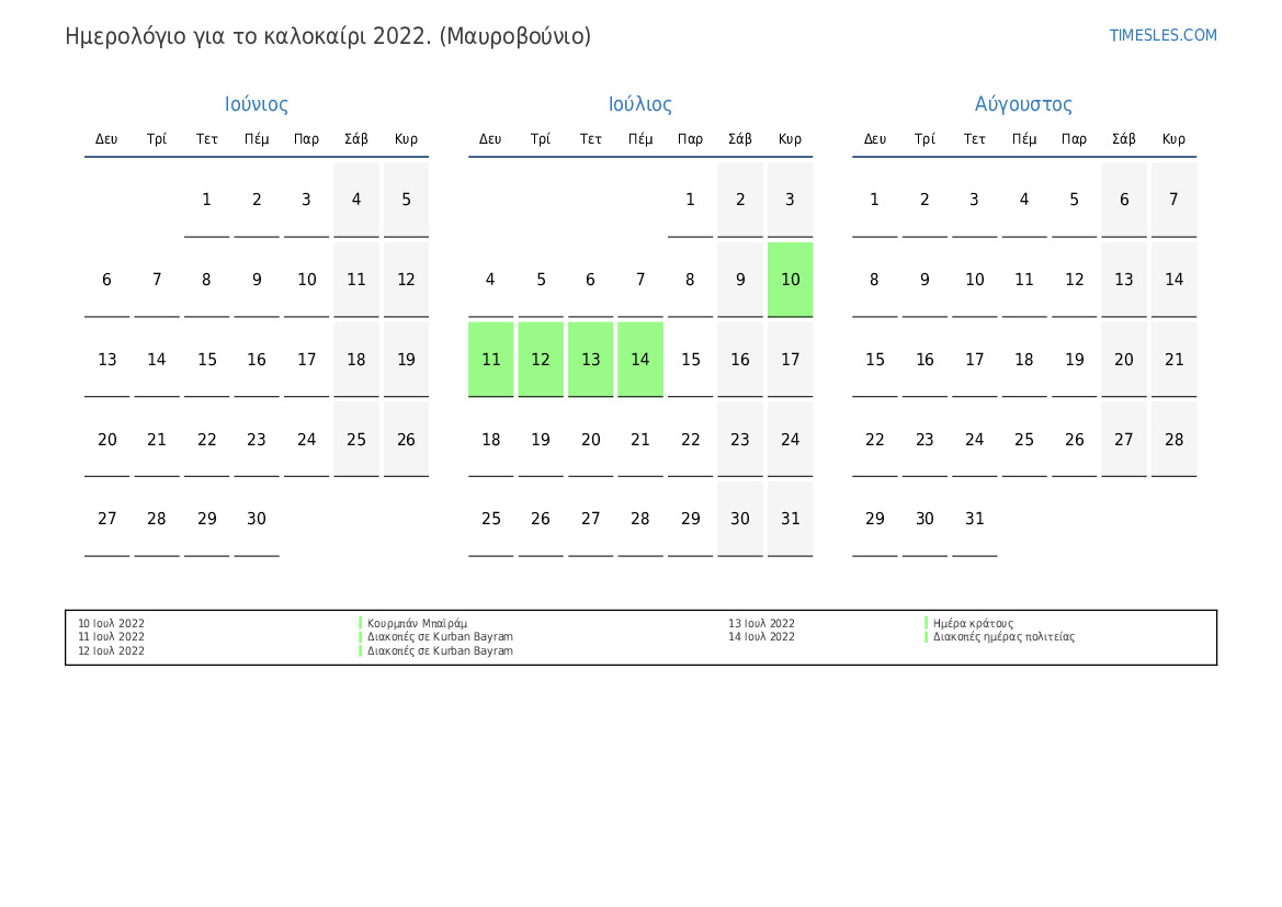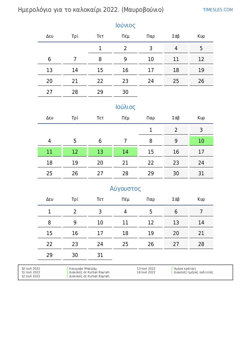 Λήψη και εκτύπωση ημερολογίου PDF με αργίες και σαββατοκύριακα για το καλοκαίρι του 2022 για το Μαυροβούνιο