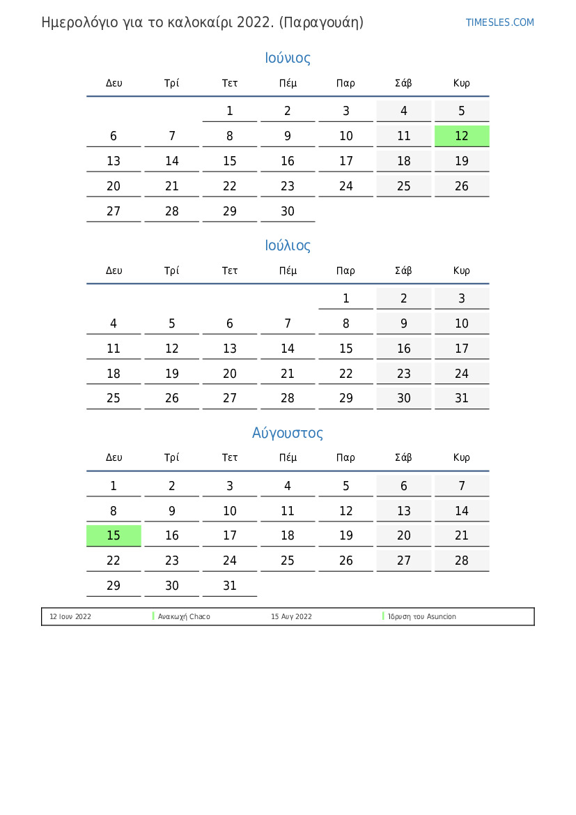 Ημερολόγιο για το καλοκαίρι 2022 για την Παραγουάη