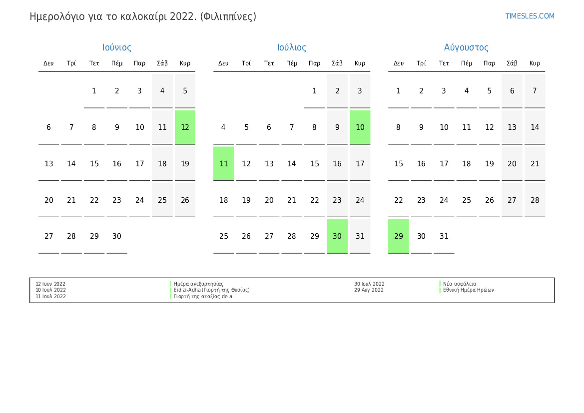 Ημερολόγιο αργιών και σαββατοκύριακων για το καλοκαίρι του 2022 για τις Φιλιππίνες