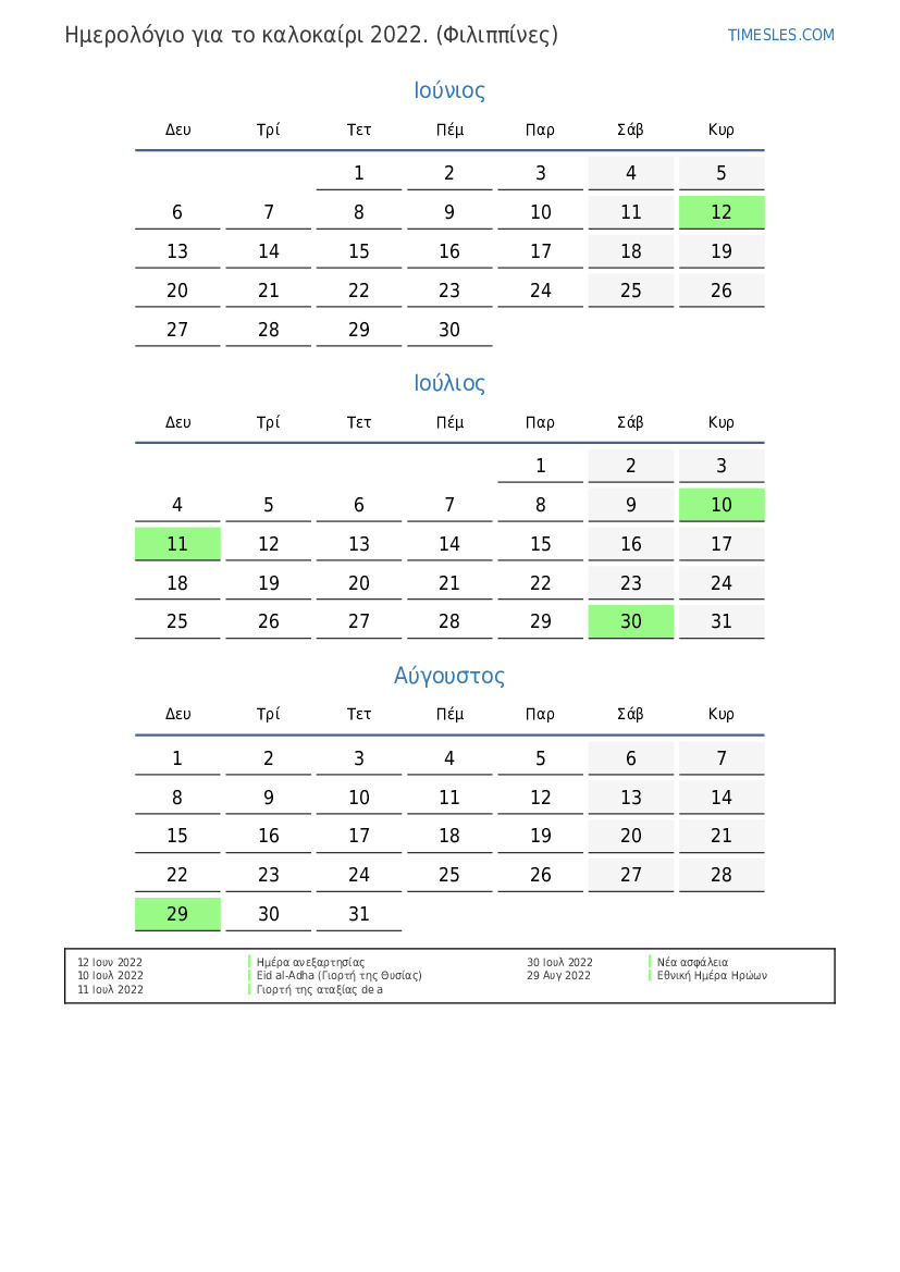 Ημερολόγιο για το καλοκαίρι 2022 για τις Φιλιππίνες