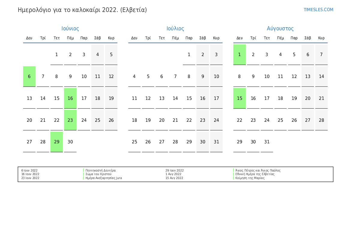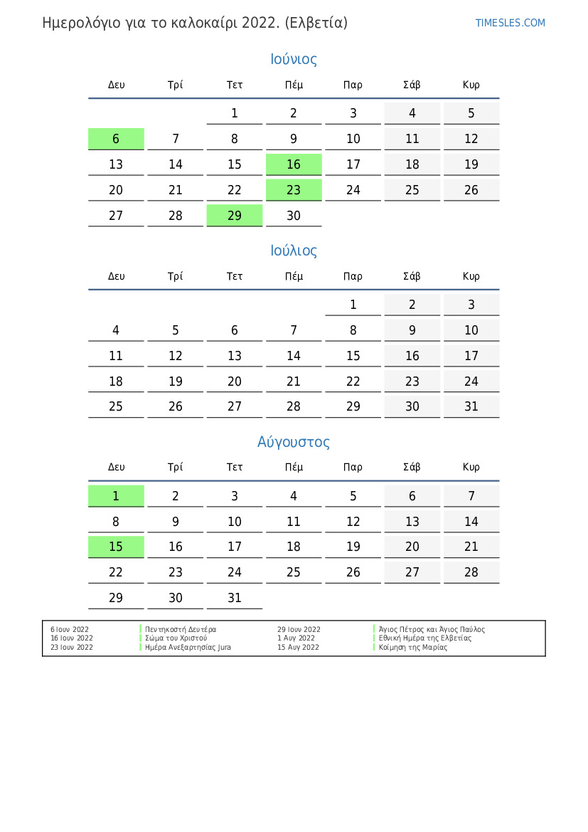 Ημερολόγιο αργιών και σαββατοκύριακων για το καλοκαίρι του 2022 για την Ελβετία