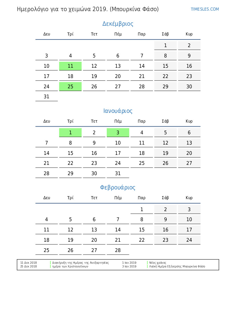 Λήψη και εκτύπωση ημερολογίου PDF με αργίες και σαββατοκύριακα για το χειμώνα του 2019 για την Μπουρκίνα Φάσο