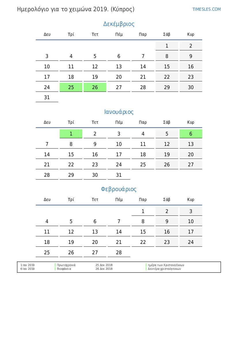 Λήψη και εκτύπωση ημερολογίου PDF με αργίες και σαββατοκύριακα για το χειμώνα του 2019 για την Κύπρο