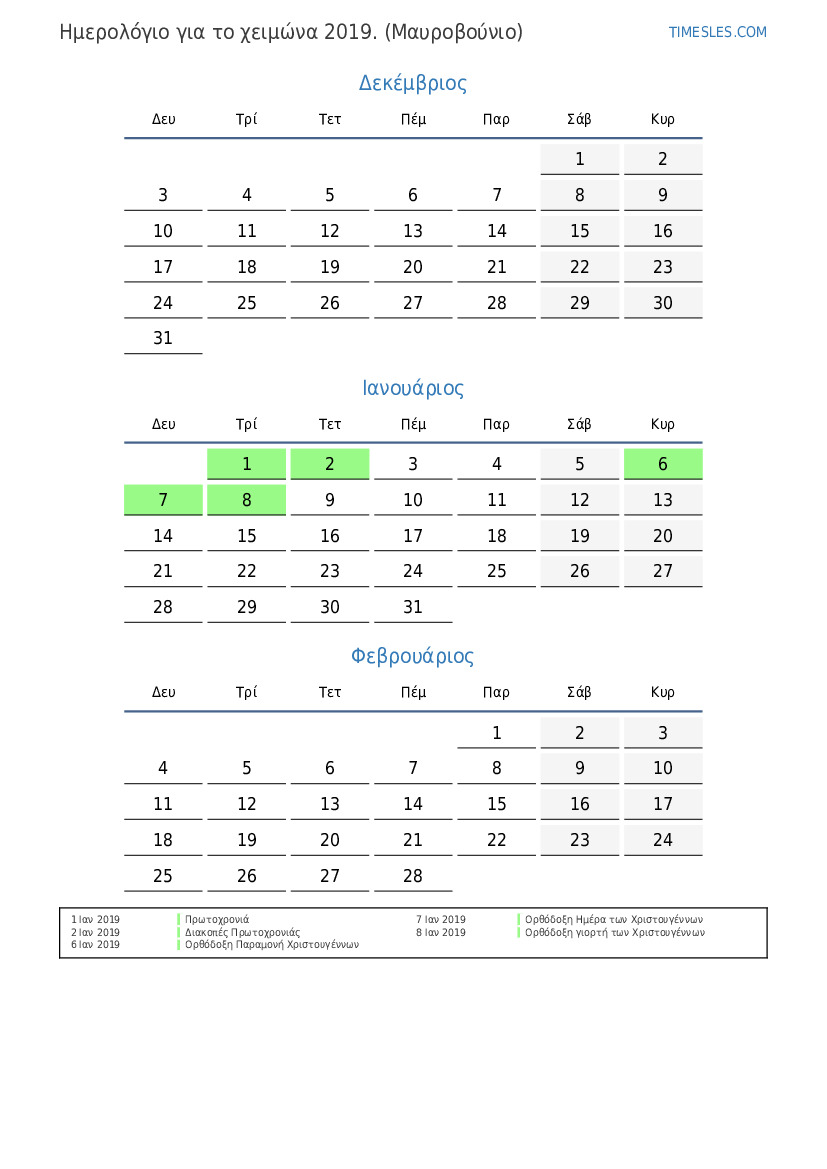 Λήψη και εκτύπωση ημερολογίου PDF με αργίες και σαββατοκύριακα για το χειμώνα του 2019 για το Μαυροβούνιο