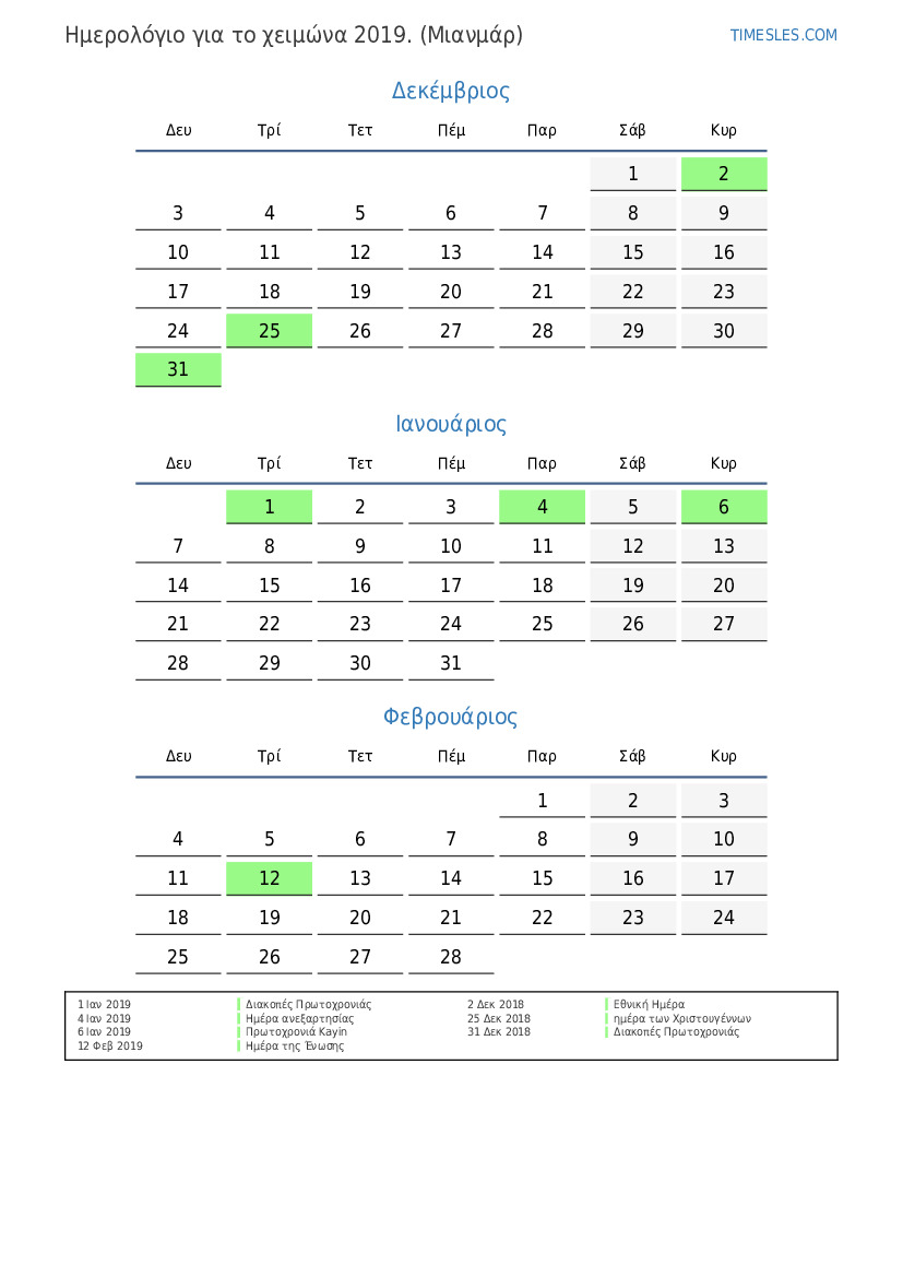 Λήψη και εκτύπωση ημερολογίου PDF με αργίες και σαββατοκύριακα για το χειμώνα του 2019 για τη Μιανμάρ