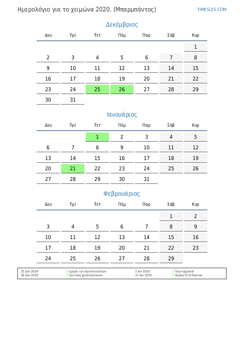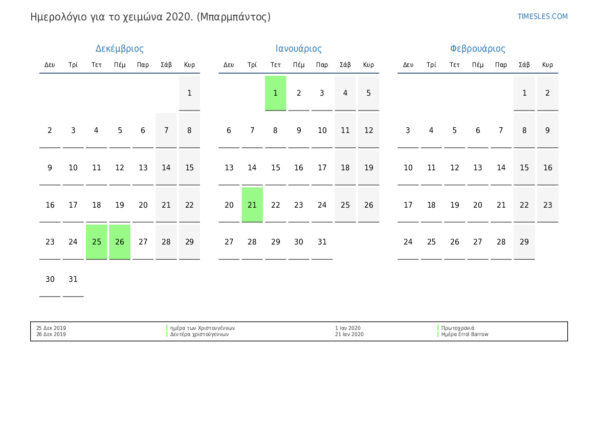 Λήψη και εκτύπωση ημερολογίου PDF με αργίες και σαββατοκύριακα για το χειμώνα του 2020 για τα Μπαρμπάντος