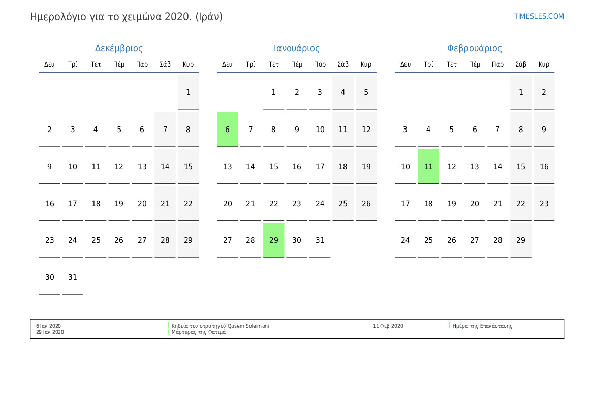 Ημερολόγιο αργιών και σαββατοκύριακων για το χειμώνα του 2020 για το Ιράν