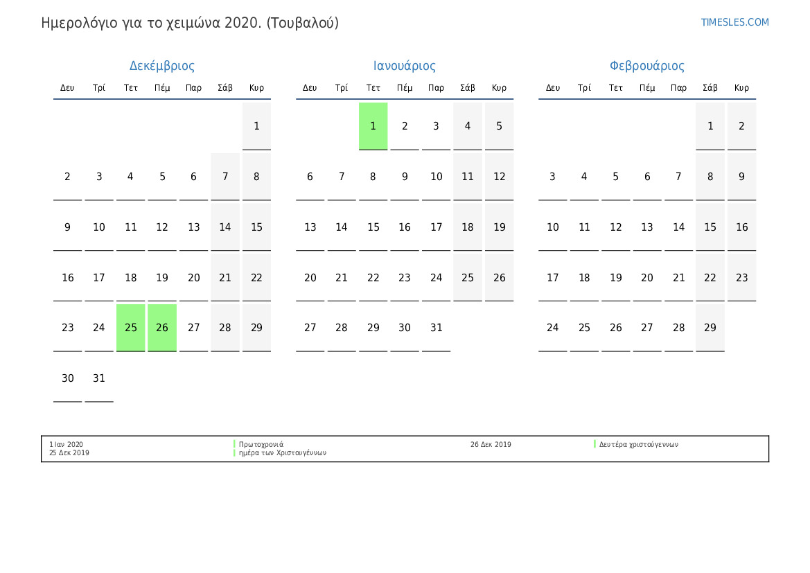 Λήψη και εκτύπωση ημερολογίου PDF με αργίες και σαββατοκύριακα για το χειμώνα του 2020 για το Τουβαλού
