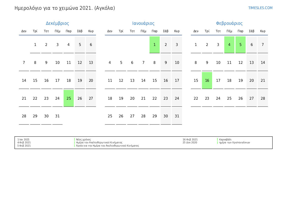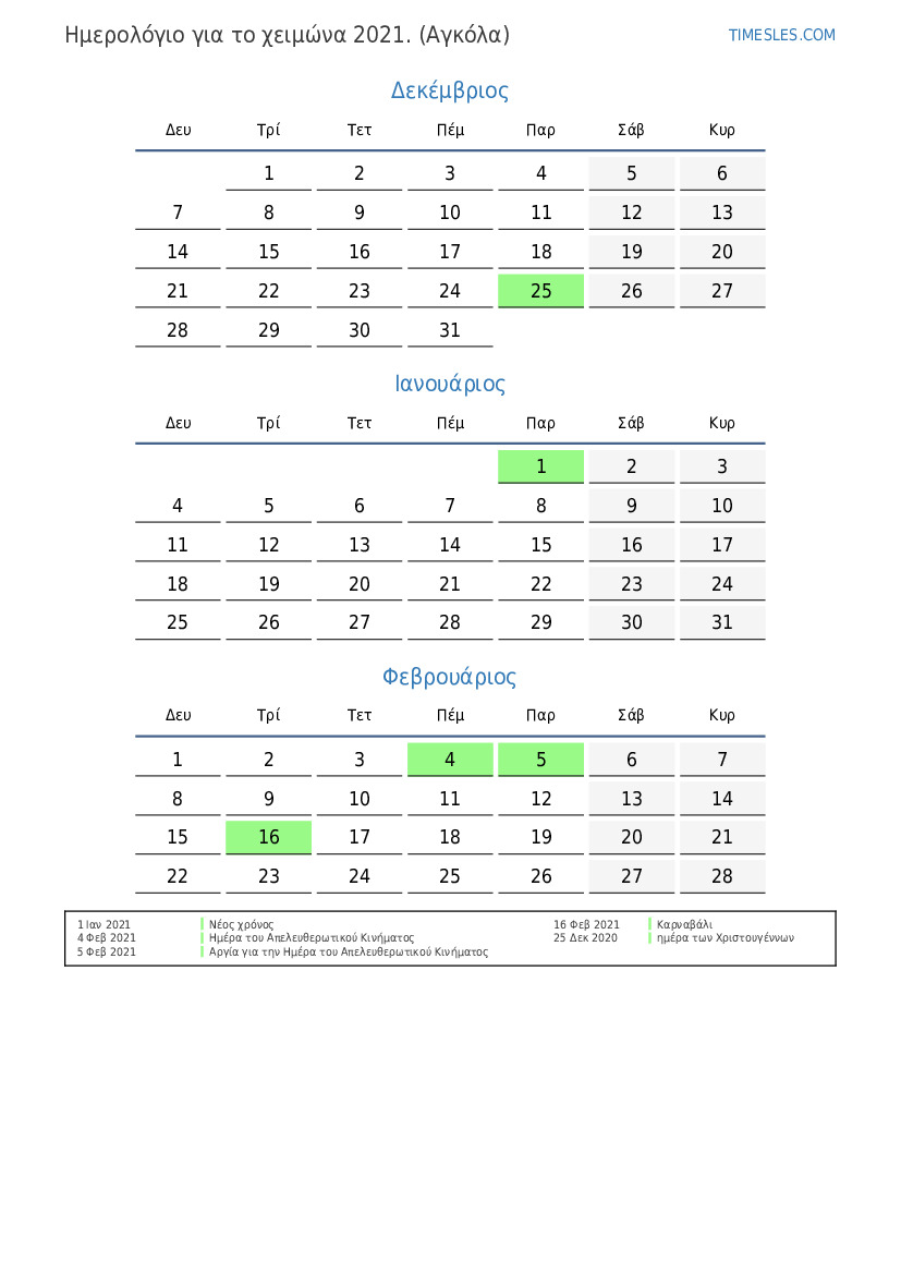 Λήψη και εκτύπωση ημερολογίου PDF με αργίες και σαββατοκύριακα για το χειμώνα του 2021 για την Αγκόλα