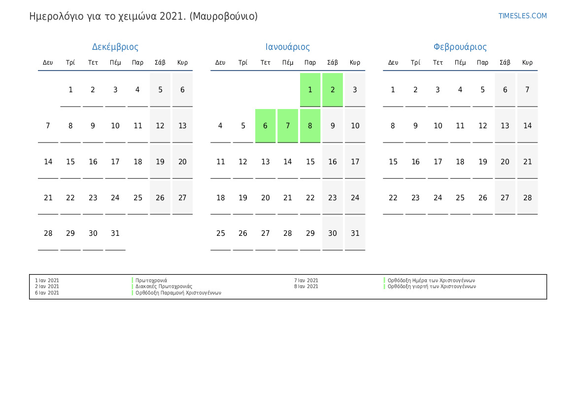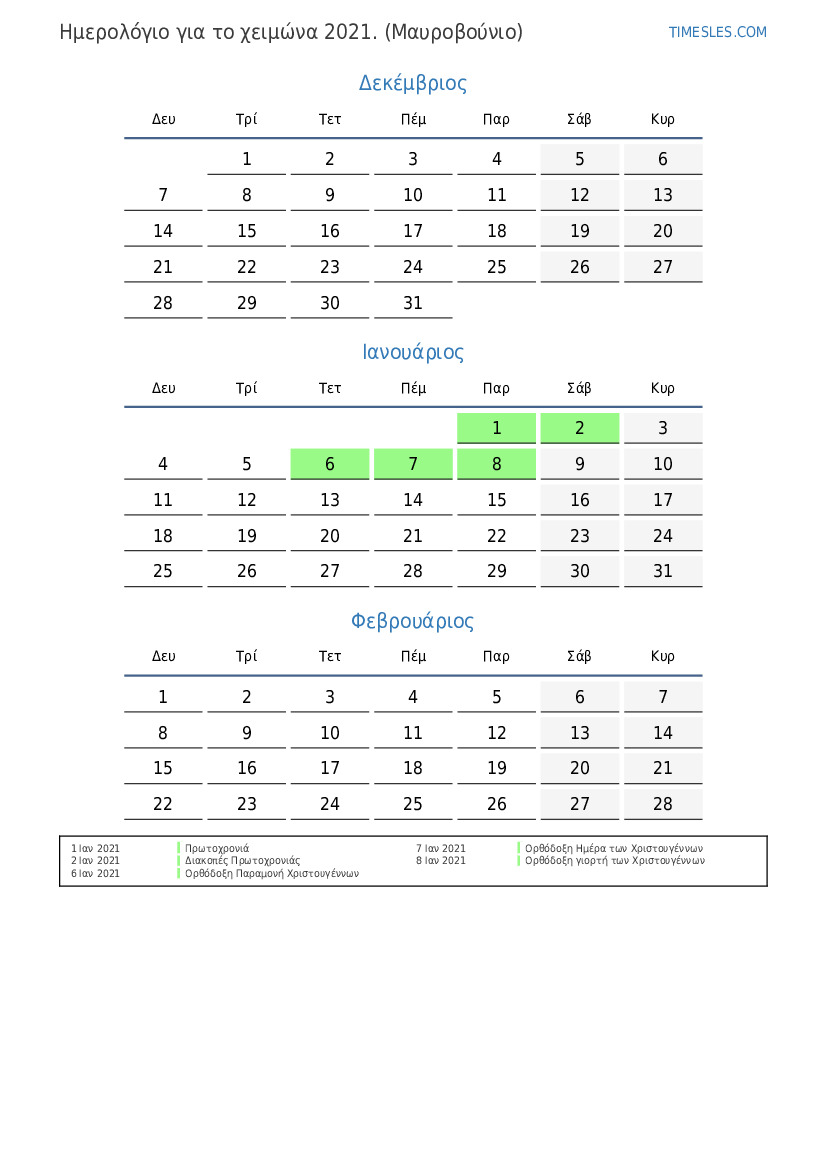 Λήψη και εκτύπωση ημερολογίου PDF με αργίες και σαββατοκύριακα για το χειμώνα του 2021 για το Μαυροβούνιο