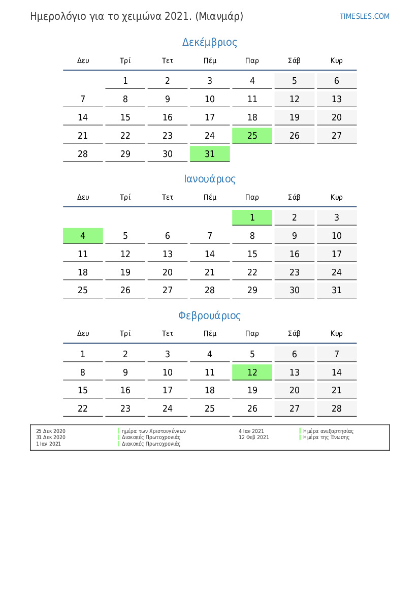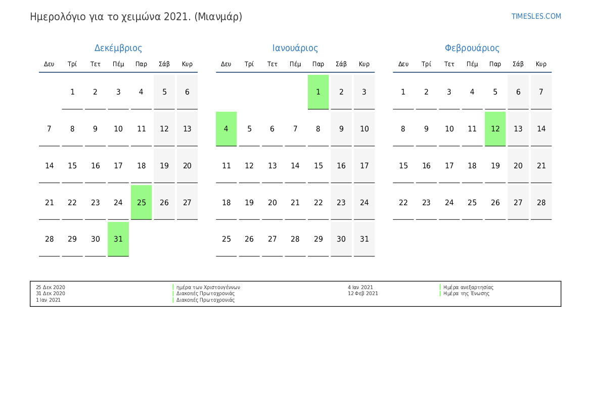 Λήψη και εκτύπωση ημερολογίου PDF με αργίες και σαββατοκύριακα για το χειμώνα του 2021 για τη Μιανμάρ