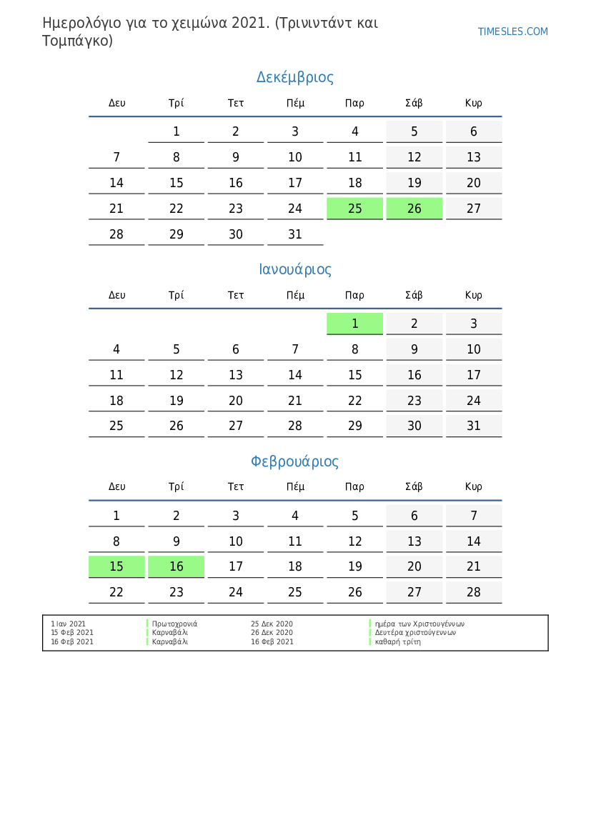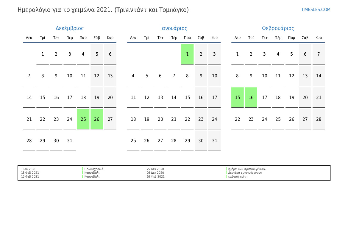 Ημερολόγιο για το χειμώνα 2021 για το Τρινιντάντ και Τομπάγκο