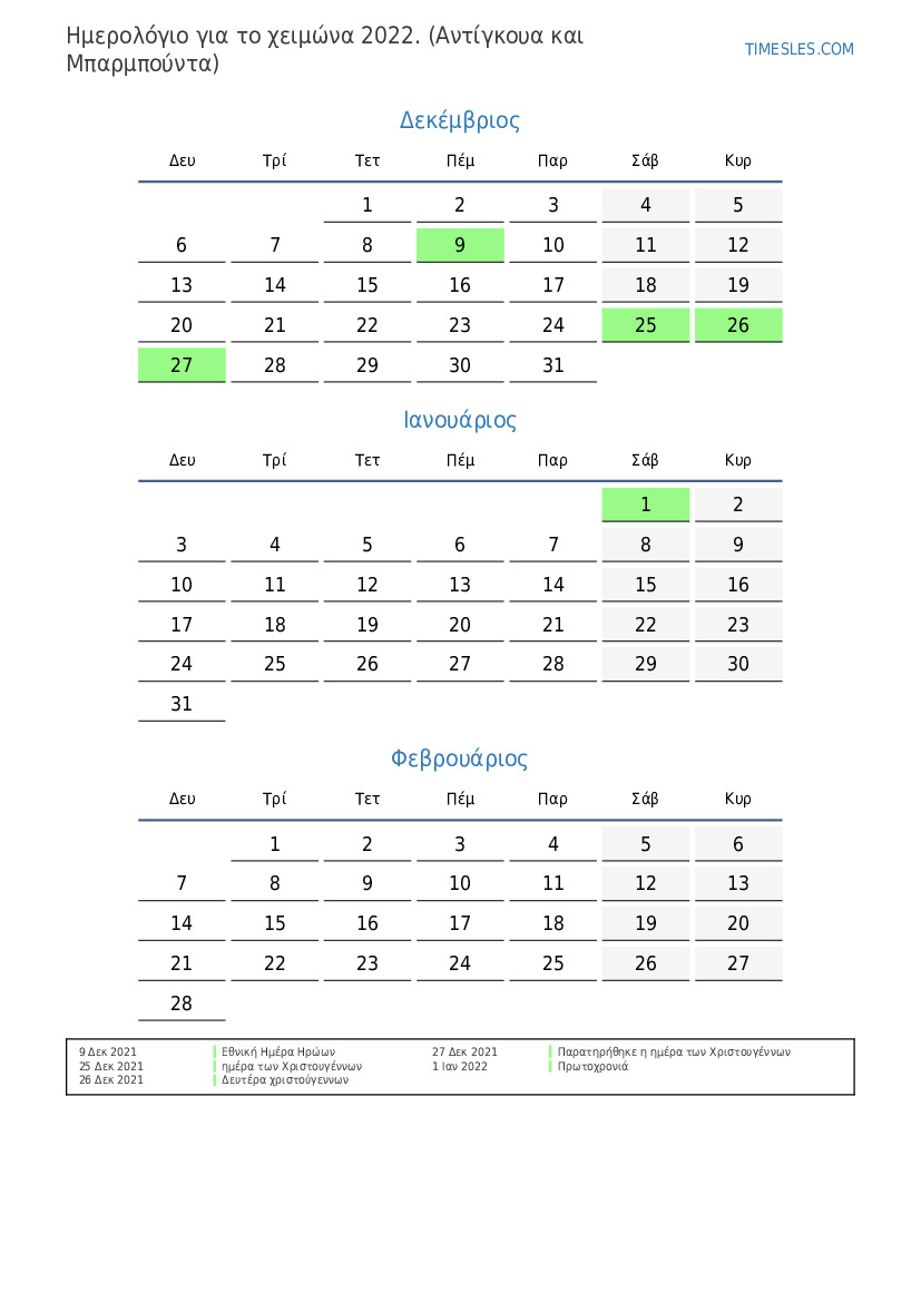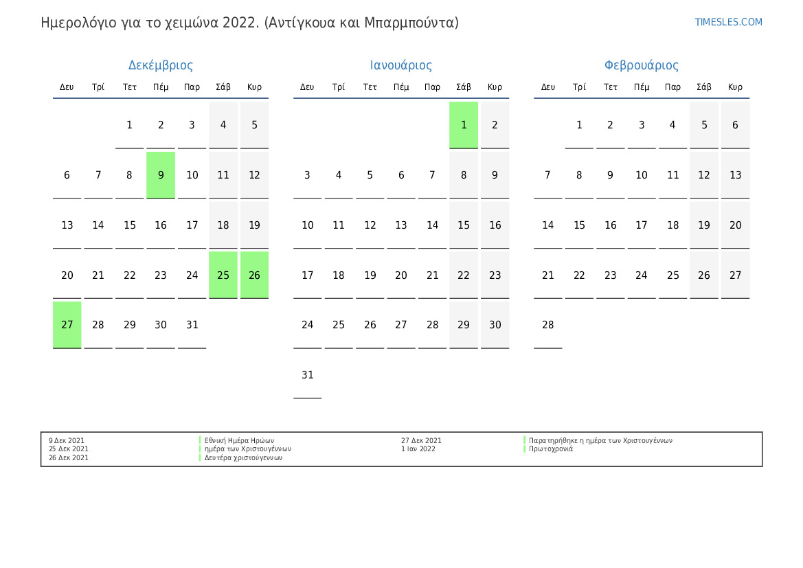 Ημερολόγιο αργιών και σαββατοκύριακων για το χειμώνα του 2022 για Αντίγκουα και Μπαρμπούντα