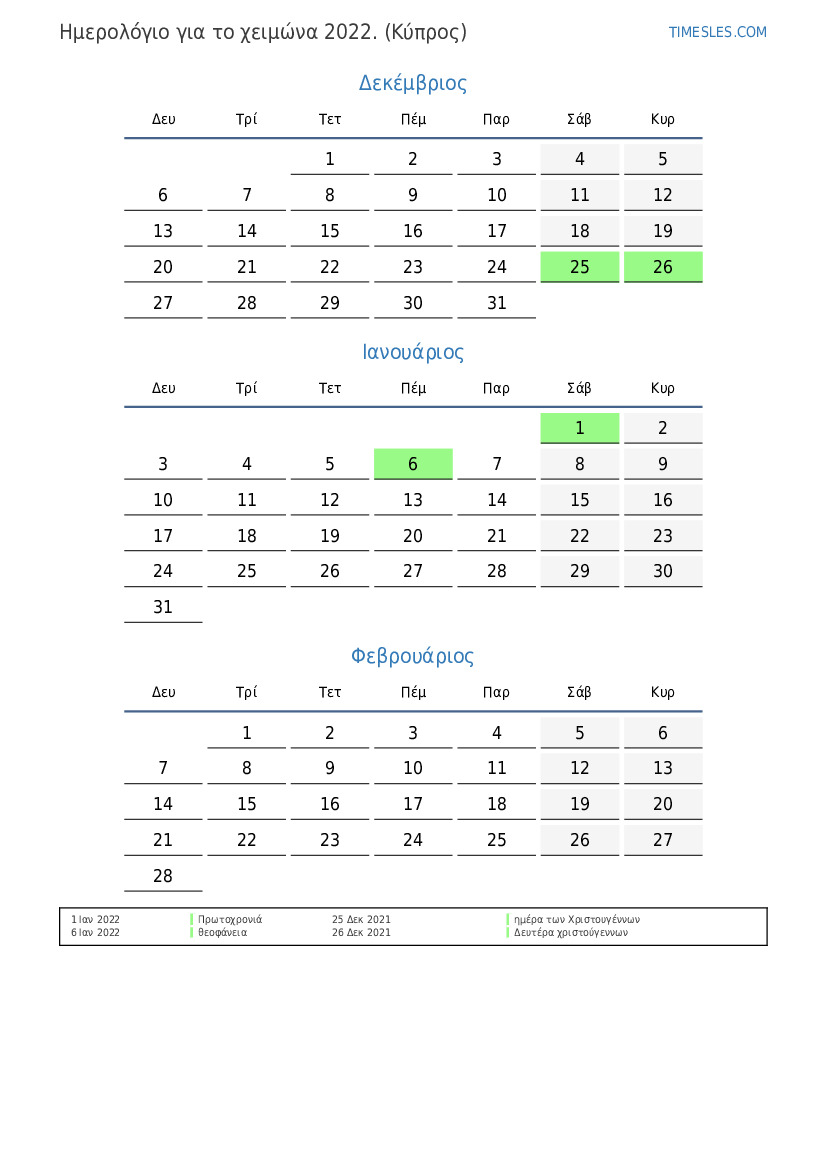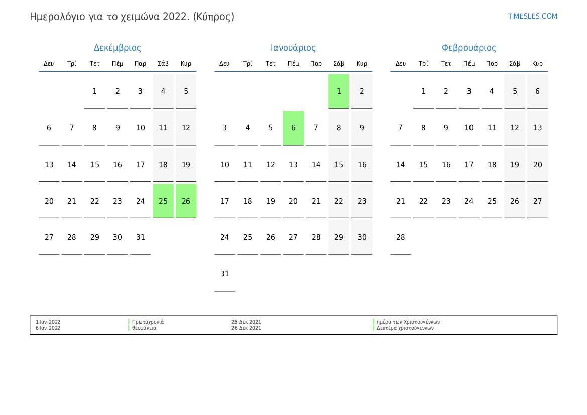 Λήψη και εκτύπωση ημερολογίου PDF με αργίες και σαββατοκύριακα για το χειμώνα του 2022 για την Κύπρο