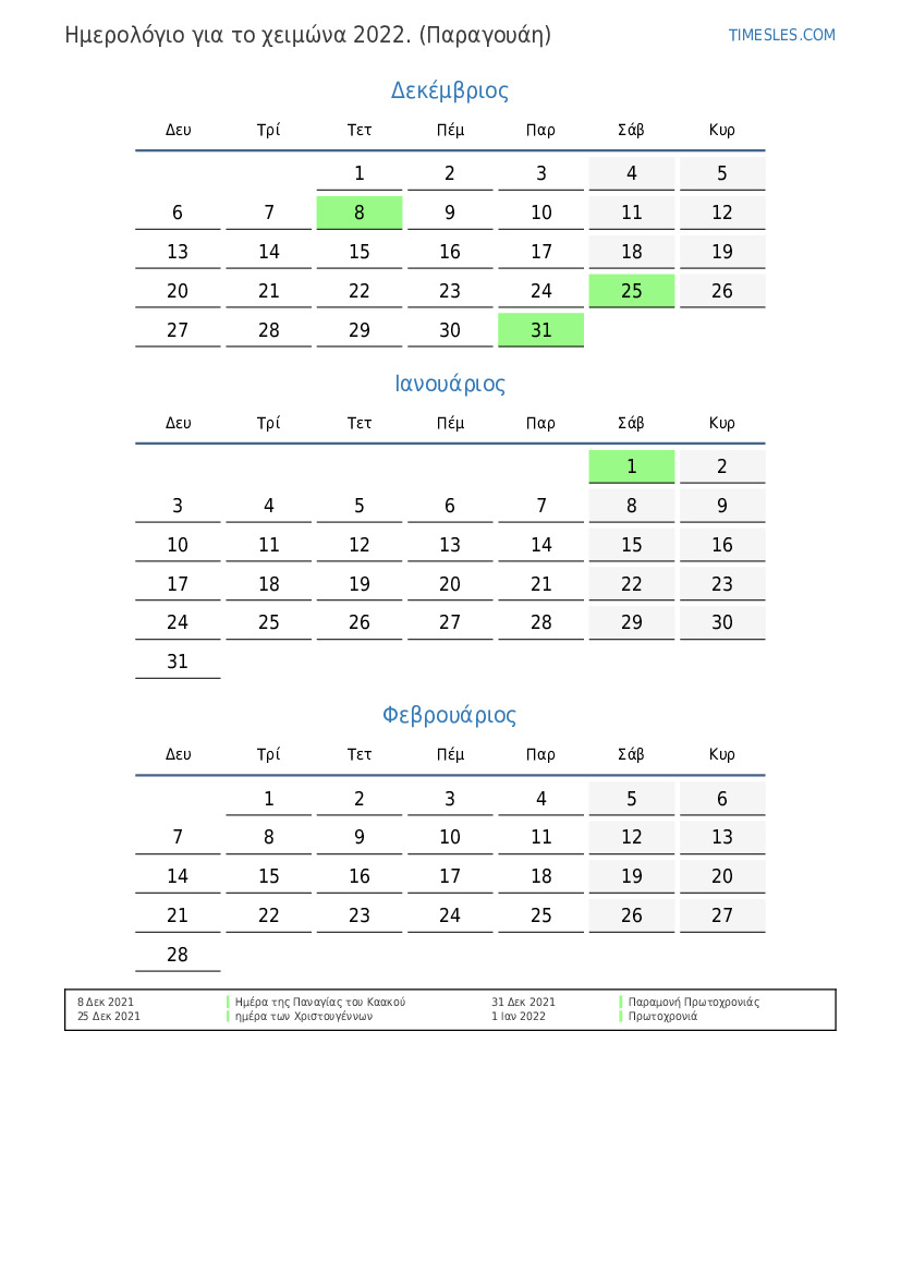 Ημερολόγιο για το χειμώνα 2022 για την Παραγουάη