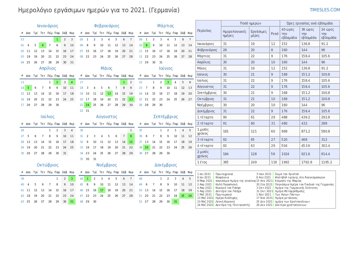 Λήψη και εκτύπωση ημερολογίου εργάσιμων ημερών PDF για τον Φεβρουάριος του 2021 για τη Γερμανία