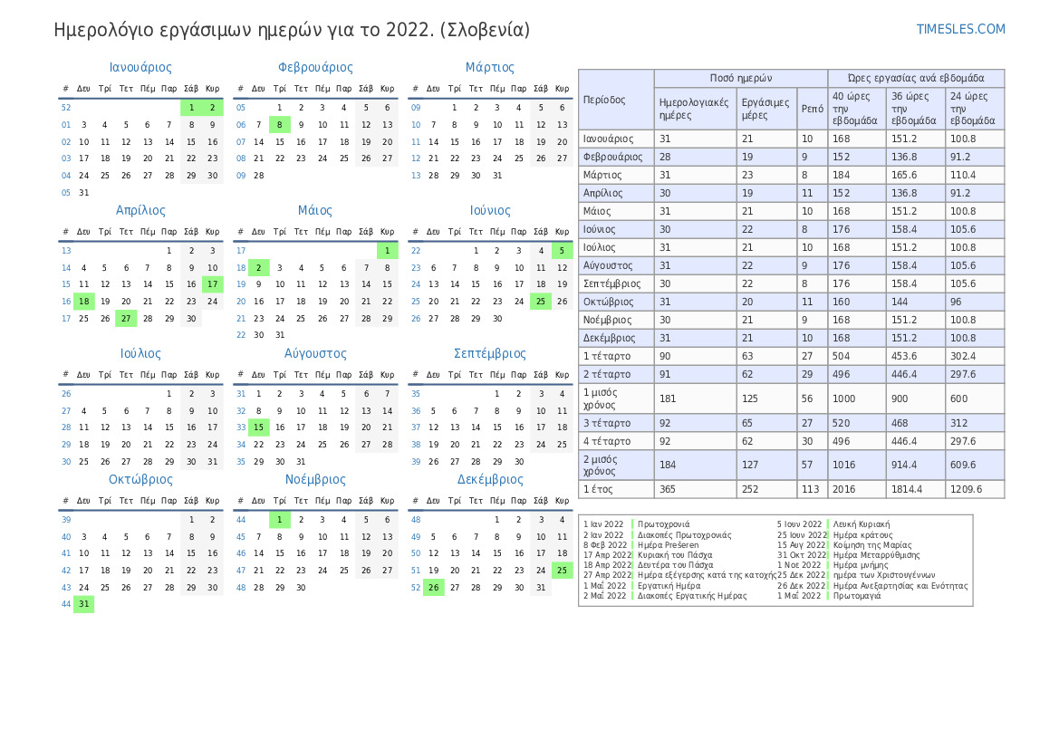 Εργάσιμες ημέρες για τον Μάρτιος του 2022. Υπάρχουν 1 διακοπές και ημέρα αδείας στη Σλοβενία για τον Μάρτιος του 2022.