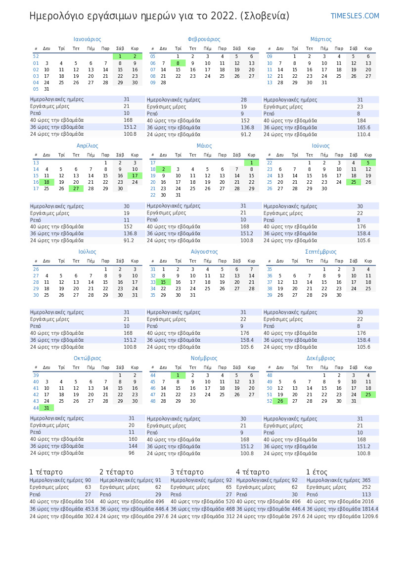 Ημερολόγιο εργάσιμων ημερών για το Μάρτιος του 2022 για τη Σλοβενία