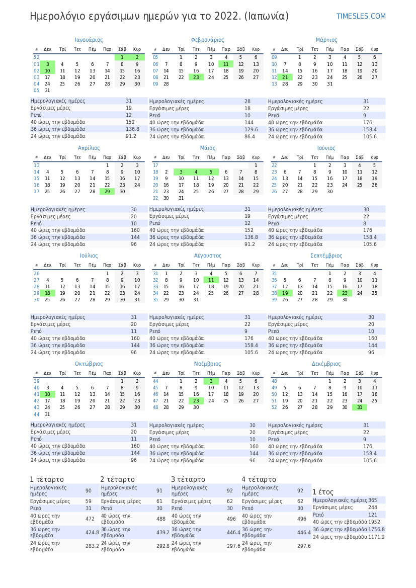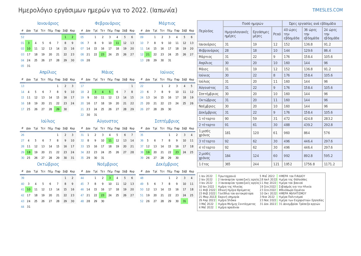 Λήψη και εκτύπωση ημερολογίου εργάσιμων ημερών PDF για τον Δεκέμβριος του 2022 για την Ιαπωνία
