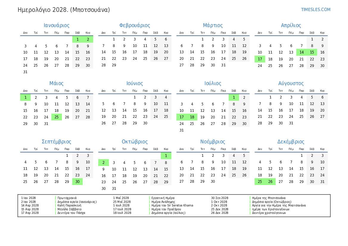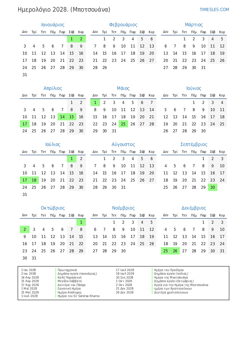 2 Οκτ 2028 Αργία για την Ημέρα της Μποτσουάνα