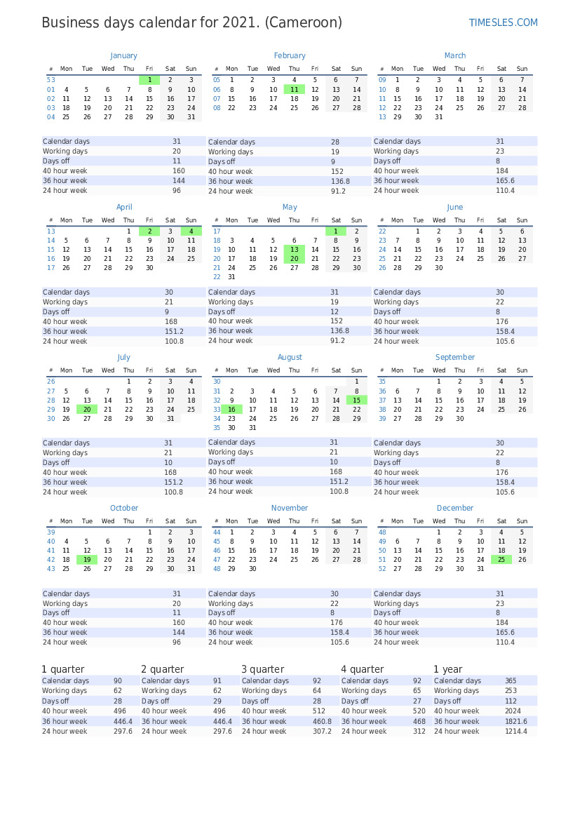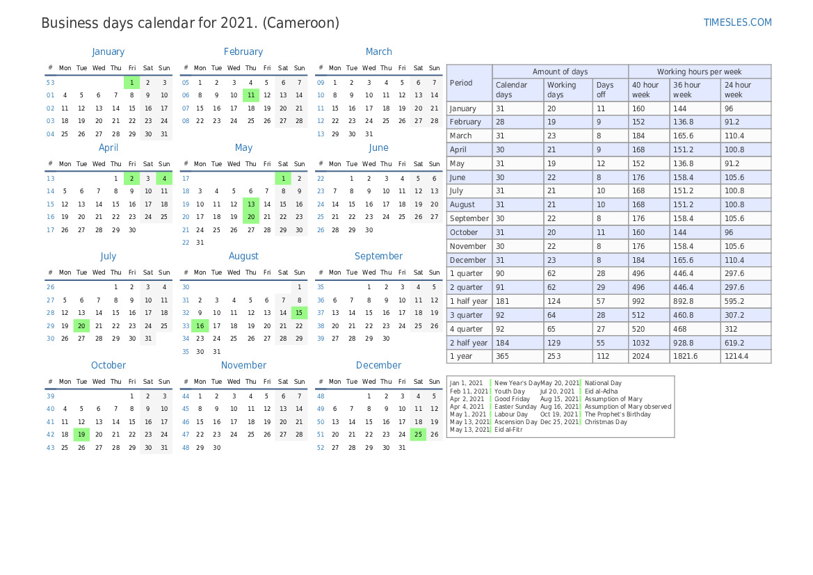 January 2021 business days calendar with weeks. Five-day work week. There are 1 holiday and day off in Cameroon for January 2021. Calendar with working hours and postponing holidays.
