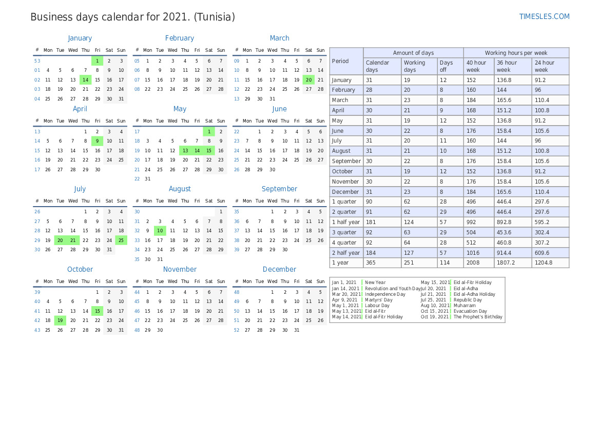 December 2021 business days calendar with weeks. Five-day work week. There are 1 holiday and day off in Tunisia for December 2021. Calendar with working hours and postponing holidays.