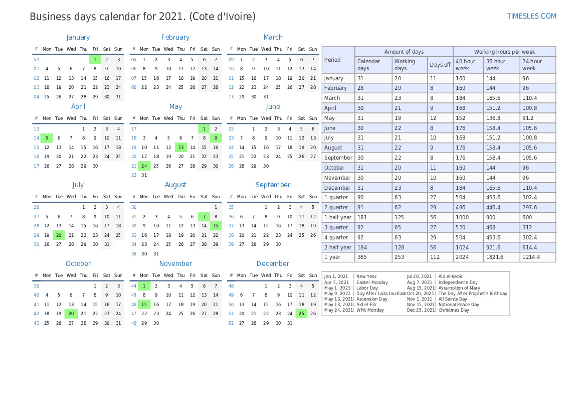 For the 4 quarter of 2021, there are 5 holidays and days off in Cote d'Ivoire. 4 quarter 2021starts on on Friday and ends on on Friday.