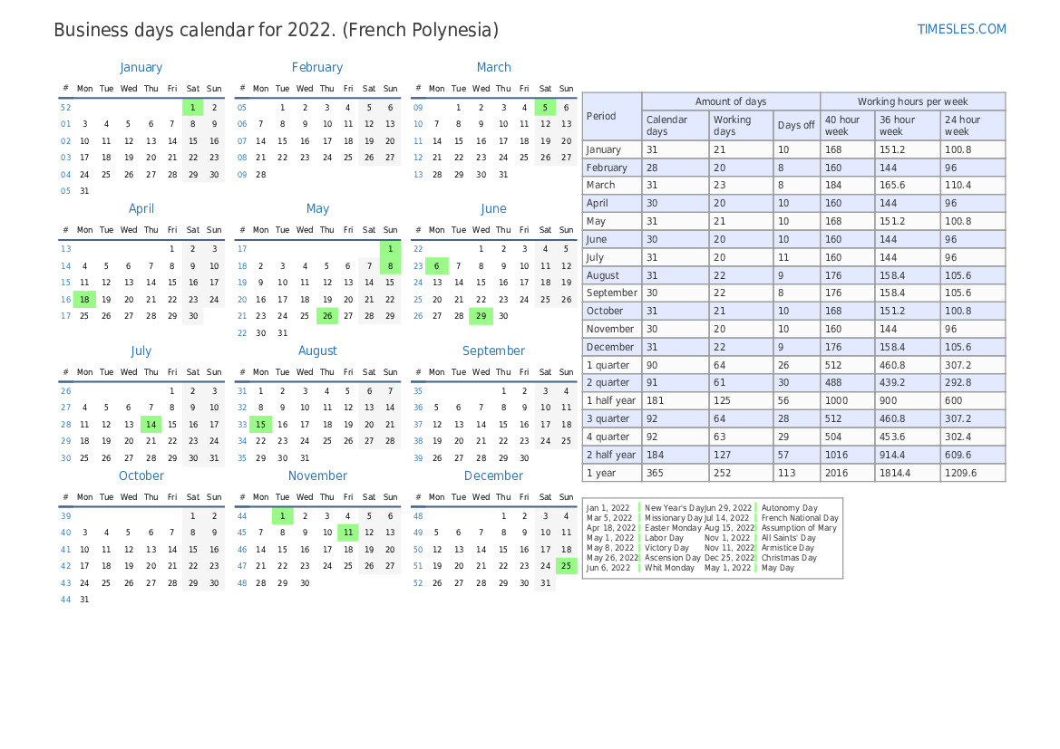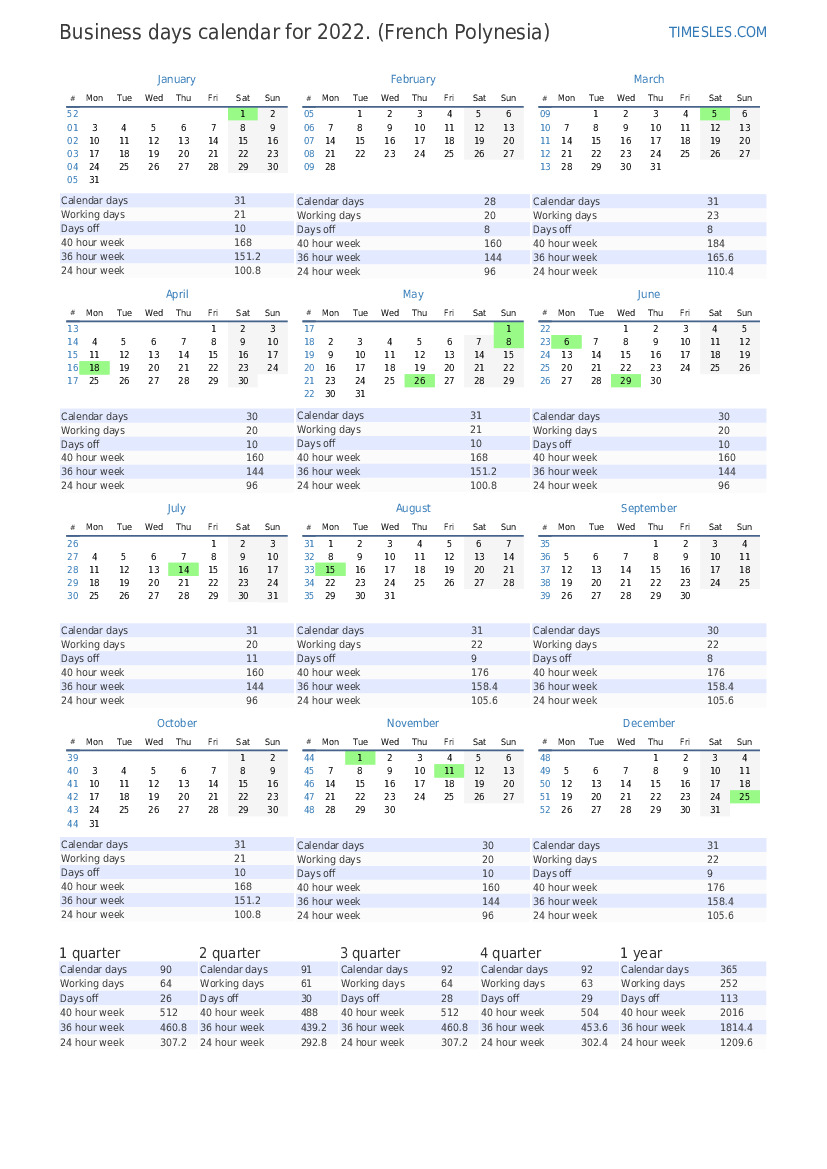 For the 3 quarter of 2022, there are 3 holidays and days off in French Polynesia. 3 quarter 2022starts on on Friday and ends on on Friday.