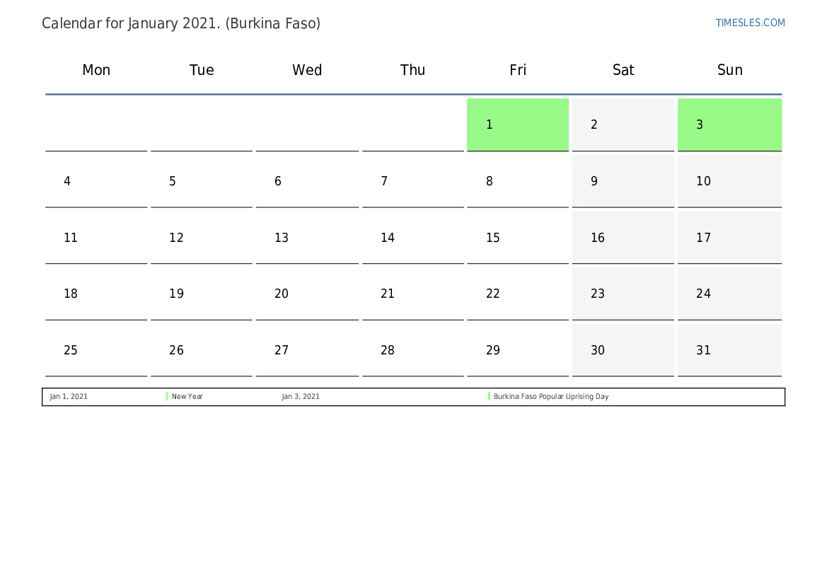 The month of January contains 31 days. This is 1 month of 2021. Season of the year: winter. The month of January starts on Friday and ends on Sunday. In the month of January 2021, there are 2 holidays and days off in Burkina Faso.