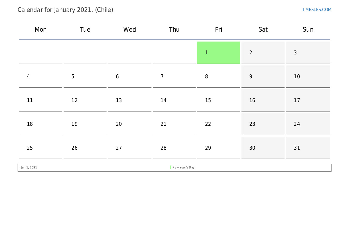 The month of January contains 31 days. This is 1 month of 2021. Season of the year: winter. The month of January starts on Friday and ends on Sunday. In the month of January 2021, there are 1 holiday and day off in Chile.