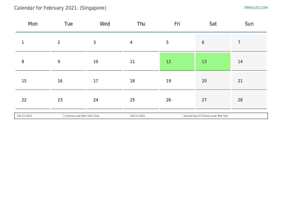 The month of February contains 28 days. This is 2 month of 2021. Season of the year: winter. The month of February starts on Monday and ends on Sunday. In the month of February 2021, there are 4 holidays and days off in Singapore.