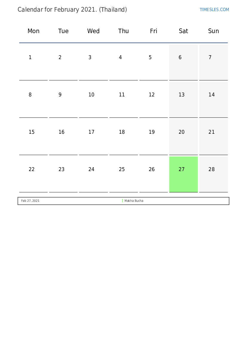 The month of February contains 28 days. This is 2 month of 2021. Season of the year: winter. The month of February starts on Monday and ends on Sunday. In the month of February 2021, there are 5 holidays and days off in Thailand.