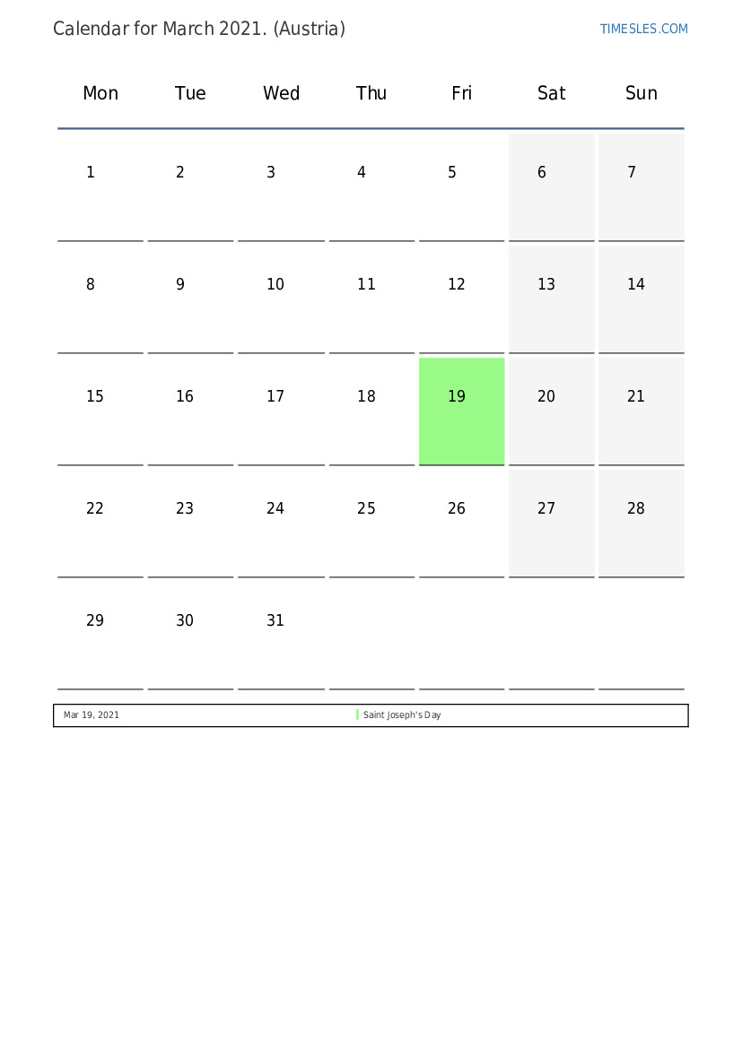 The month of March contains 31 days. This is 3 month of 2021. Season of the year: spring. The month of March starts on Monday and ends on Wednesday. In the month of March 2021, there are 4 holidays and days off in Austria.