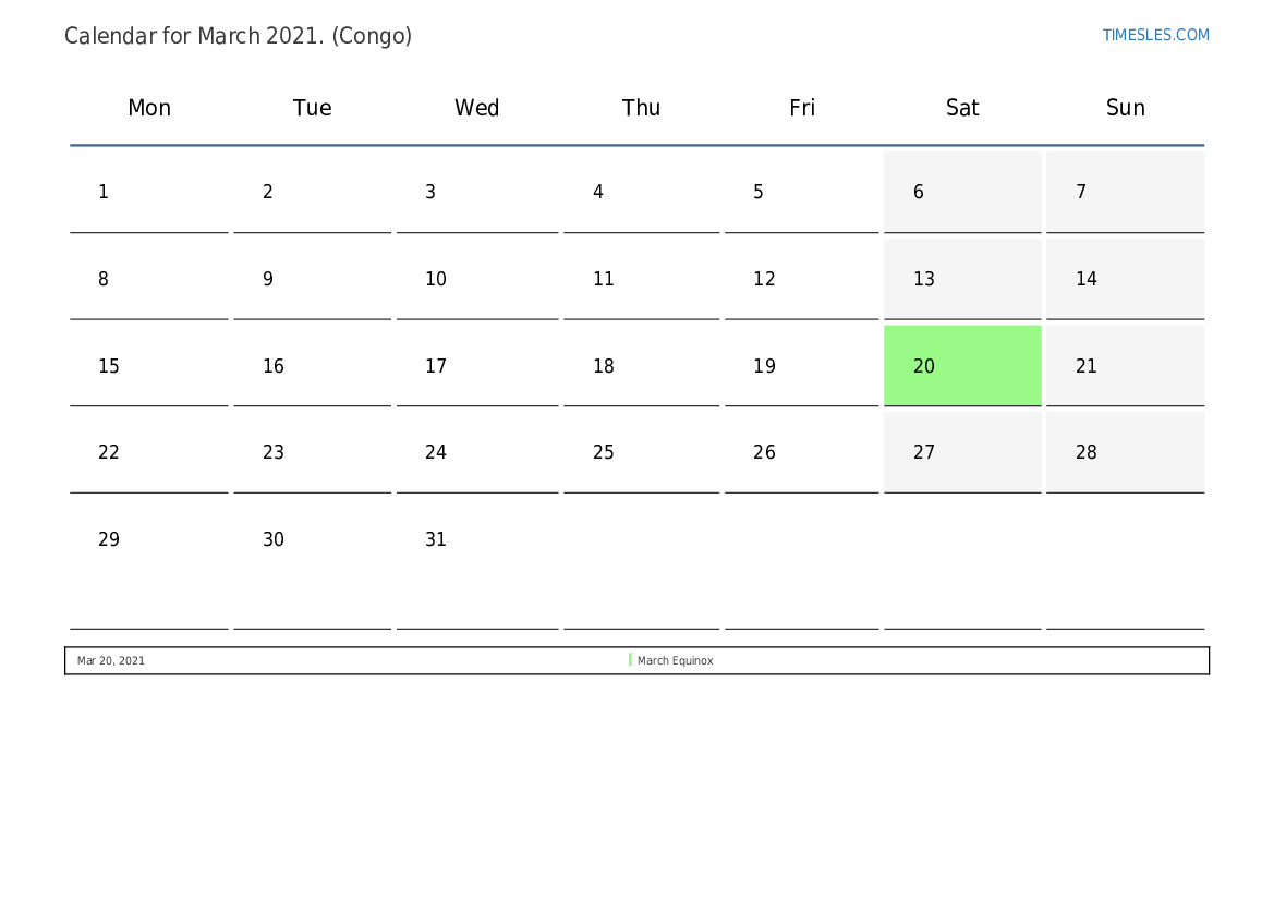 The month of March contains 31 days. This is 3 month of 2021. Season of the year: spring. The month of March starts on Monday and ends on Wednesday. In the month of March 2021, there are 1 holiday and day off in Congo.